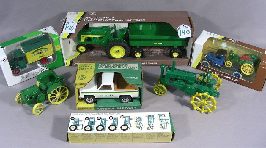 6 John Deere tractors and truck in original boxes and 1 John Deere tractor with no box. John Deere 1958 Model S30LT tractor and wagon.
