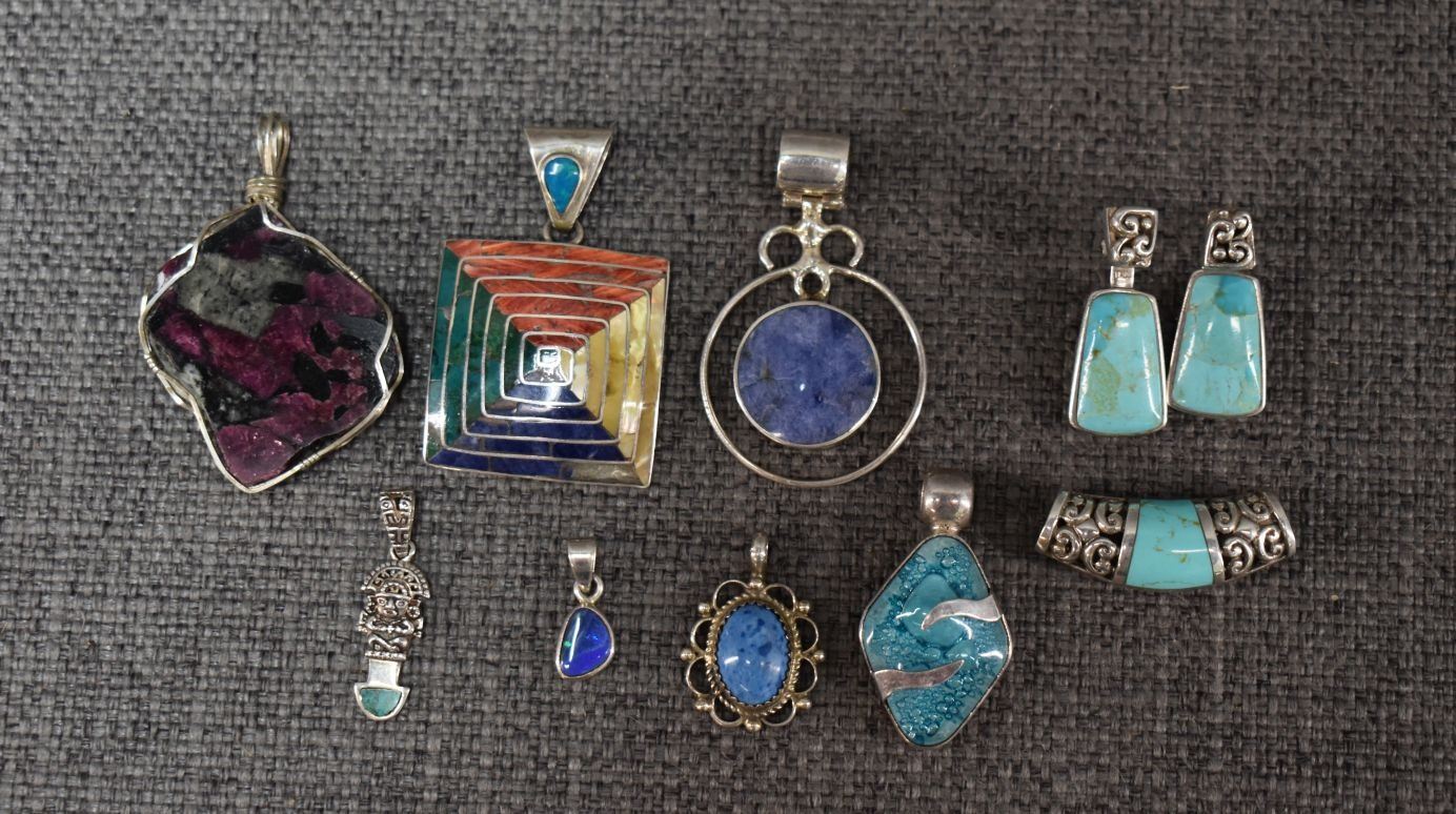 contemporary all sterling silver with various stones and glass largest 2" x 1.25" total weight 65 grams