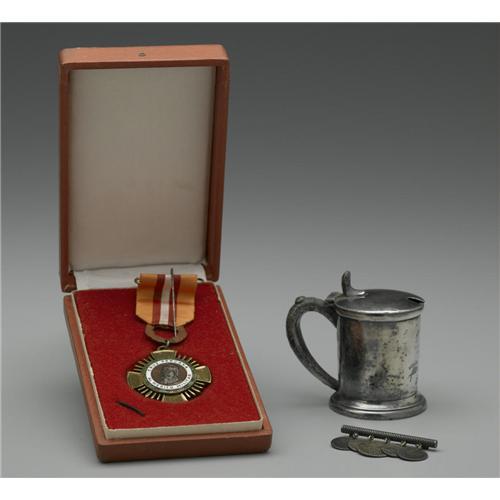 <B>A GROUP OF SILVER PIECES</B></I><BR>Various makers<BR><BR>The group including a plate-silver syrup server with coat of arms to the front with inscription <I>Patria M.N.C.,</B></I> marked to underside, <I>L & C</B></I> (3.5in. high); <I>together with,</B></I> a pin of five coins with various figures and initials monogrammed to reverse of coins (1.25 x 2.4in.); and, a Peruvian Military Cross, 1930, with Cruz Peruana to one side and Coronel Francisco Bolognesi to the other (4.5 x 2in.)<BR>3 <BR><BR><B>Condition Report:</B> Syrup server needs to be polished and coins from pin have wear to the surface, otherwise all pieces are in good condition