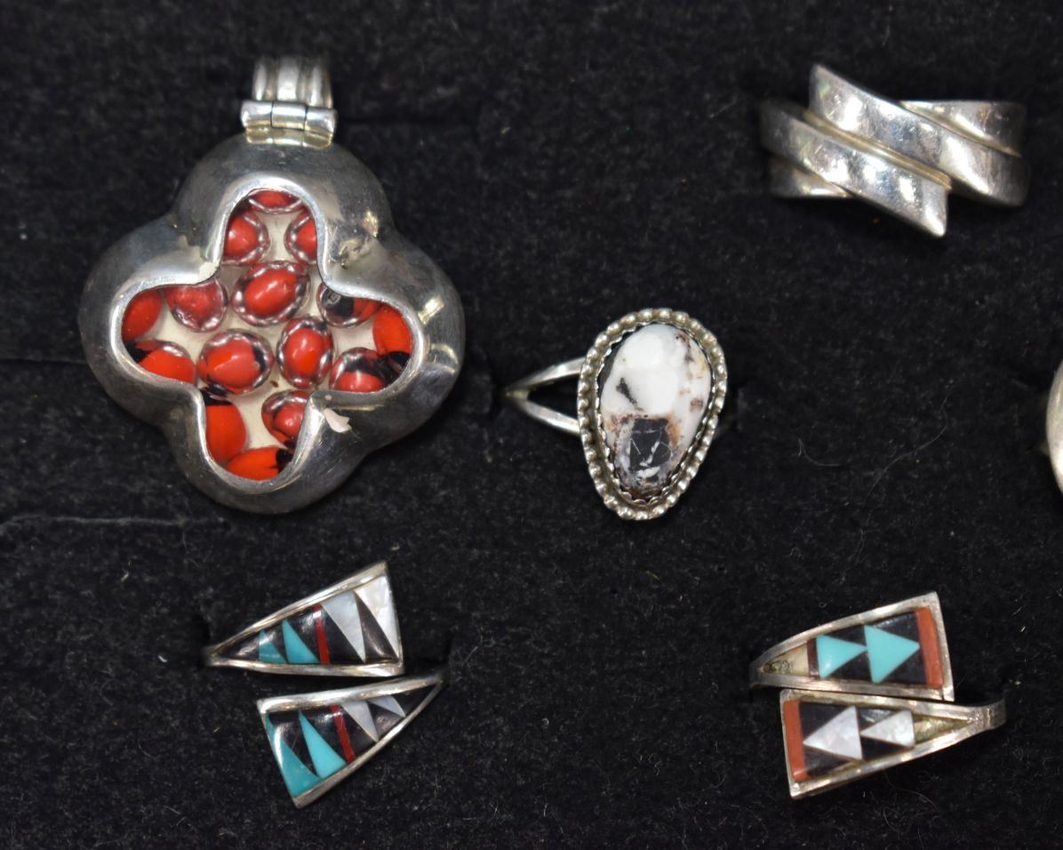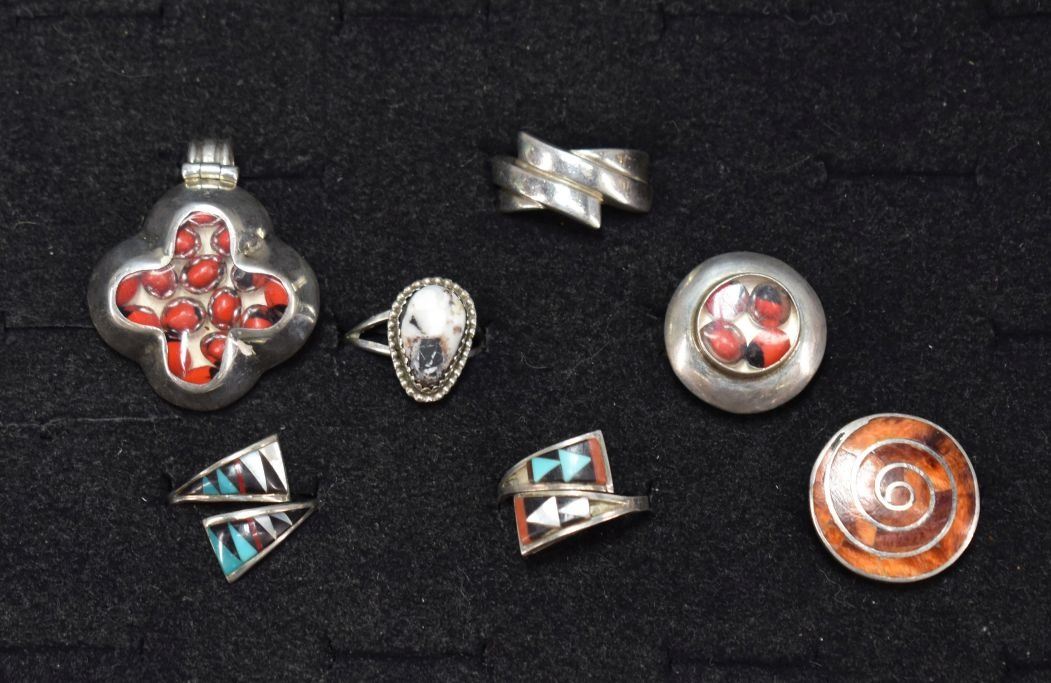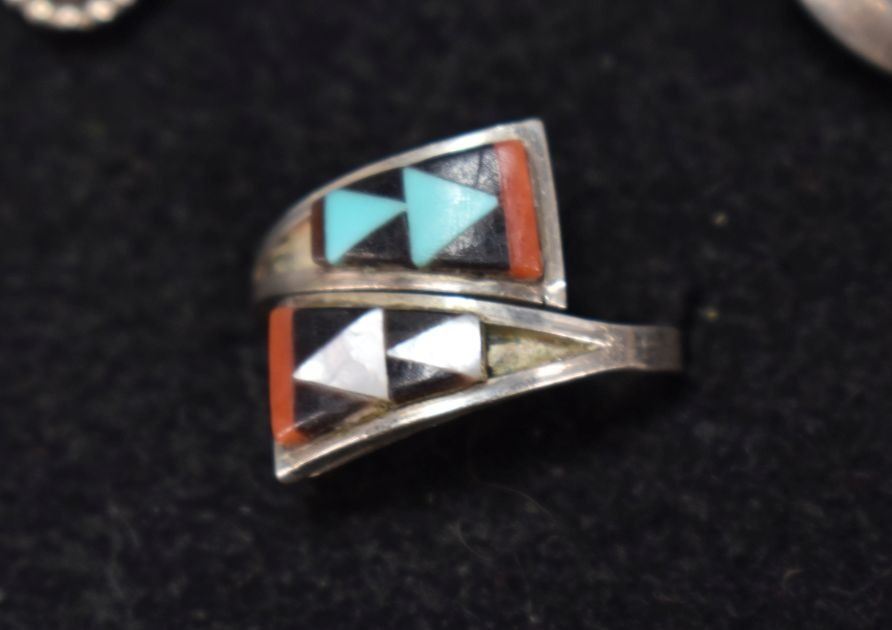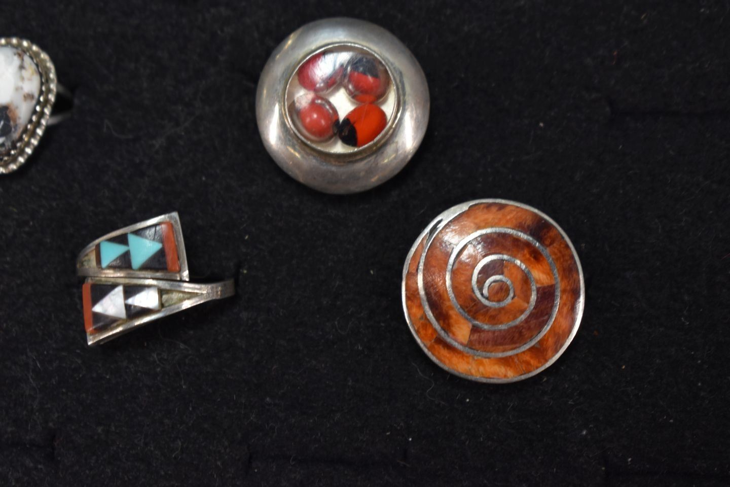 vintage all sterling silver two with inlaid stone one white buffalo others have various design total weight 38 grams
