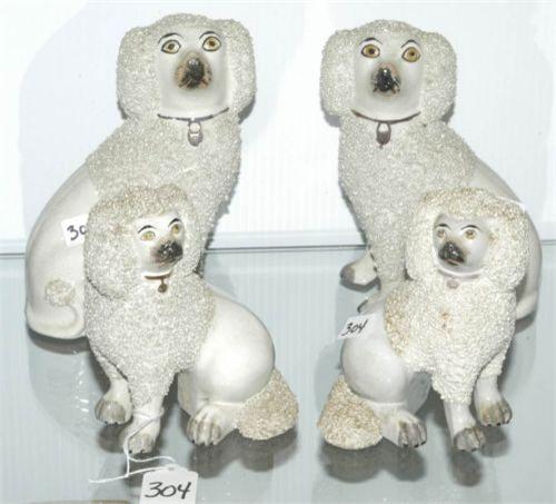 GROUP OF STAFFORDSHIRE POODLES, two matching pair, 7" high and 5" high, condition: one large dog badly repaired, PACKING AND SHIPPING (excluding insurance) $30,