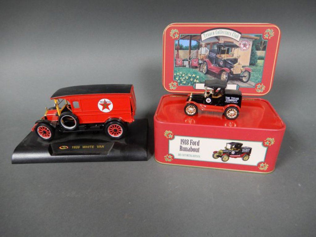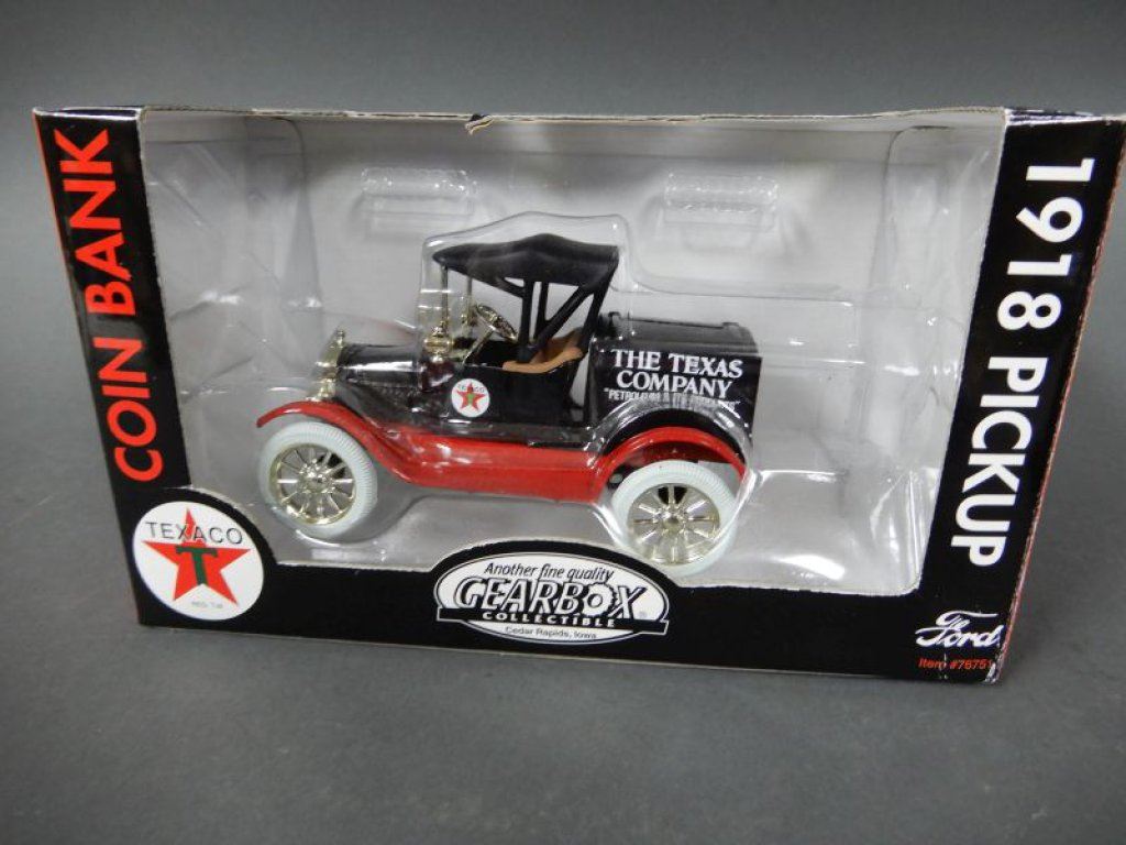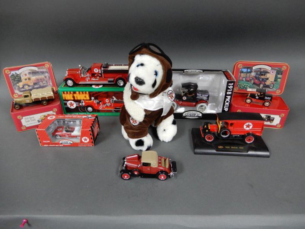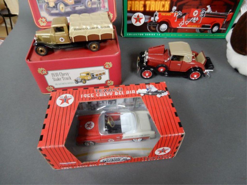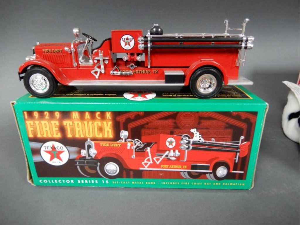 STUFFED ANIMAL - TEXACO COLLECTOR CLUB TIN WITH 1930 CHEVY STAKE TRUCK - 1931 CHEVY SPORTS CABROLET - ERTL FIRE TRUCK BANK/BOX - GEARBOX COIN BANK 1918 PICKUP - TEXACO COLLECTOR CLUB TIN WITH 1918 FORD RUNABOUT -