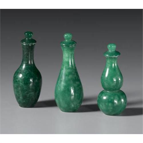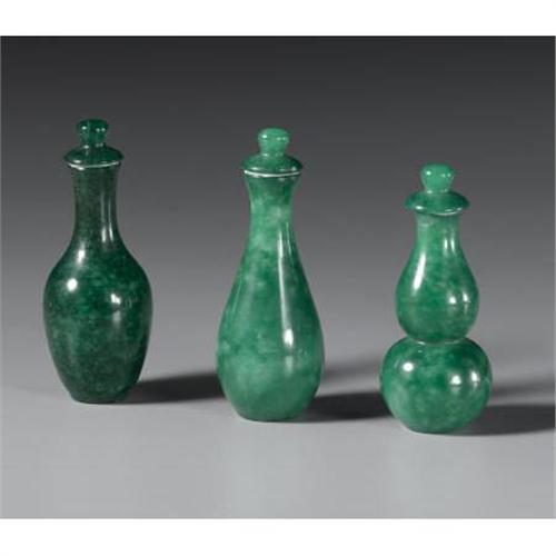 <B>GROUP OF THREE SNUFF BOTTLES</B></I><BR><BR>Group of three Chinese carved jade/hardstone snuff bottles of varying shape and size. All of bright green coloration<BR>Tallest: 3-3/4in. high<BR><BR> <B>Condition Report:</B> Normal signs of wear as appropriate with age.<BR><BR><b>Shipping:</b> Miscellaneous Collectibles, Larg (<a target="_blank" href="http://www.heritageauctions.com/common/shipping.php">view shipping information</a>)