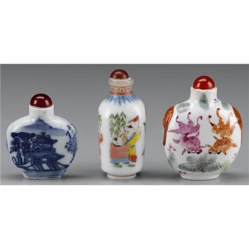 <B>GROUP OF CHINESE SNUFF BOTTLES</B></I><BR><BR>Group of three Chinese snuff bottles, two of porcelain and one of glass. Of various shape and size. All with painted designs on white ground: one with a pavilion and antelope in a landscape, one with men and boys in a landscape, one with koi and faux double handles. All signed to base<BR>Tallest: 3in. high<BR><BR> <B>Condition Report:</B> Normal signs of wear as appropriate with age.<BR><BR><b>Shipping:</b> Hollowware/Pottery/Glass, Small (<a target="_blank" href="http://www.heritageauctions.com/common/shipping.php">view shipping information</a>)