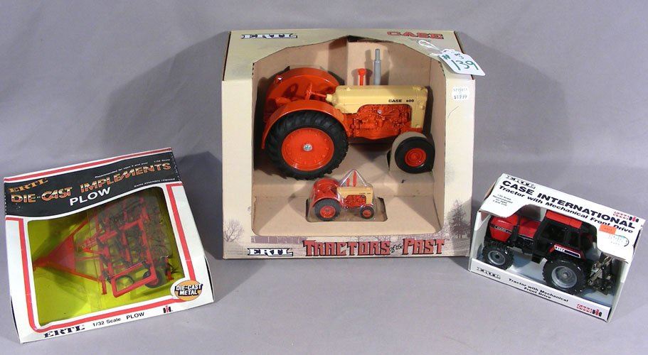 1:32 scale tractor with mechanical front drive in original box, plow in box and Ertl Tractors of the Past Case 600 in original box.