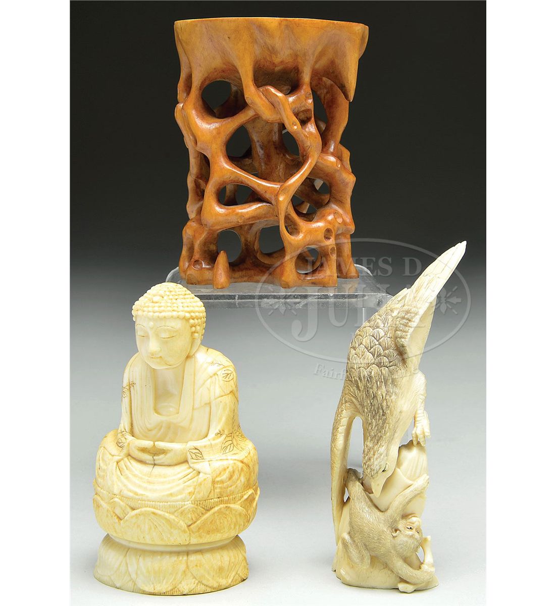 19th century, Japan. Three pieces to include: two ivory carvings, one of Buddha, one of a hawk; and the other a boxwood stand. SIZE: Hawk: 5" h. PROVENANCE: From a private New York State collection. CONDITION: Generally good with cracks to the ivory. 9-92551, 9-92552, 9-92559