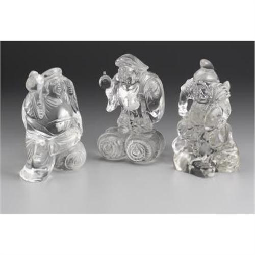 <B>GROUP OF THREE ROCK CRYSTAL FIGURES</B></I><BR><BR>Group of three rock crystal figures of the Japanese deities: one of Ebisu, and two models of Daikokou, each with their traditional accoutrements<BR>5-7/8in., 6in. and 6-3/8in.<BR><BR>Provenance: Arthur James Galleries, H3, no.1735<BR><BR> <B>Condition Report:</B> One figure with two tiny chips to edge of base.<BR><BR><b>Shipping:</b> Miscellaneous Collectibles, Larg (<a target="_blank" href="http://www.heritageauctions.com/common/shipping.php">view shipping information</a>)
