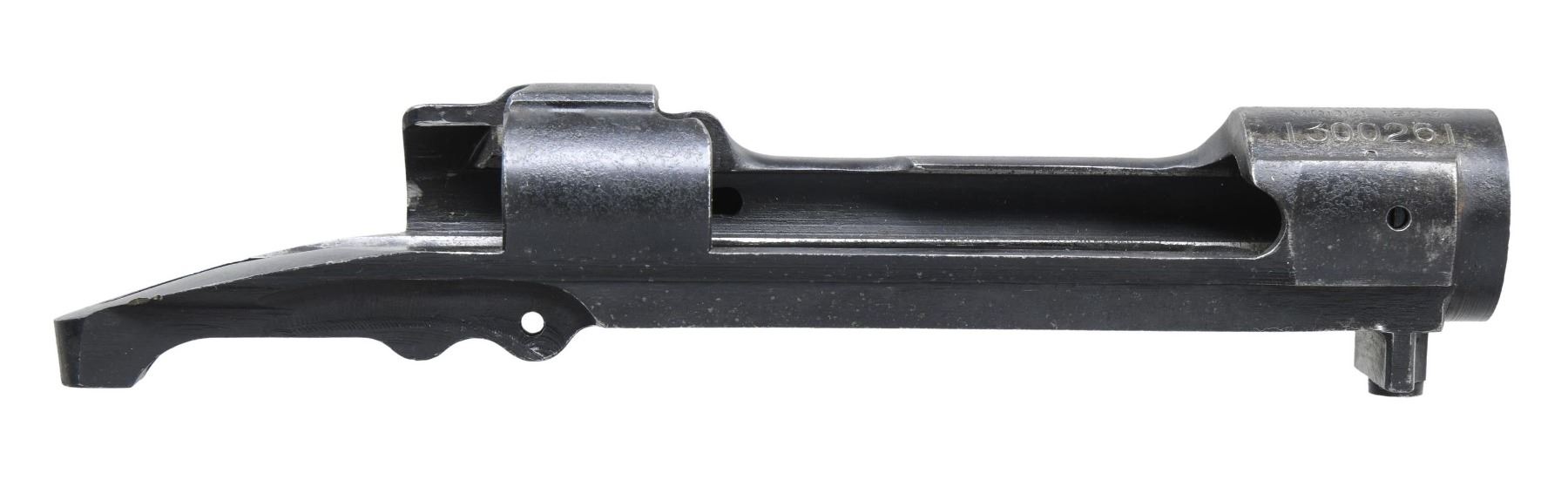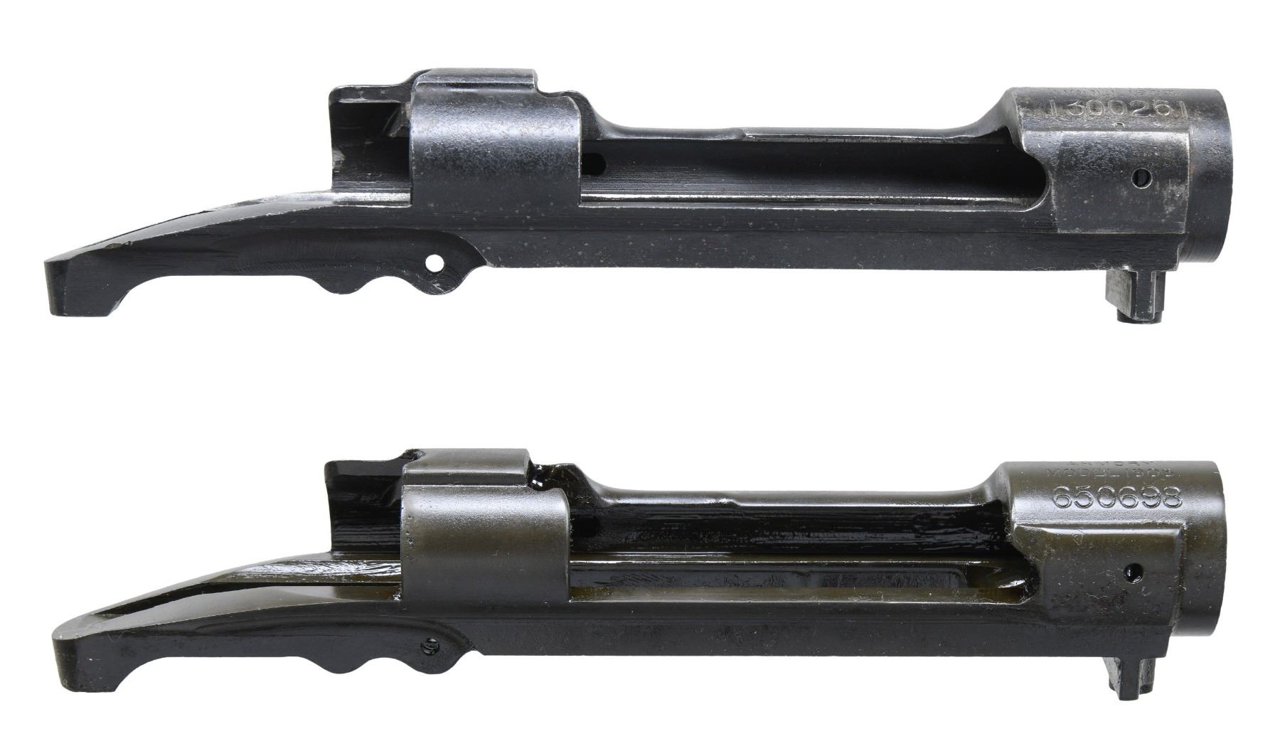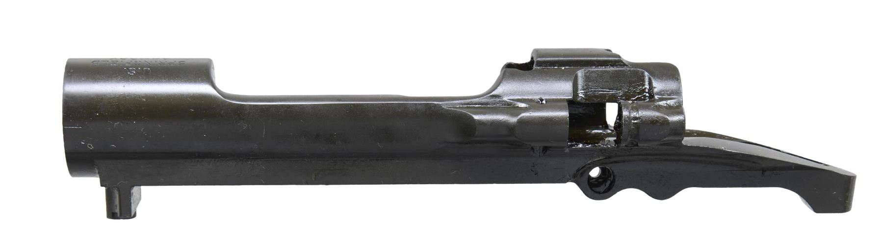RECEIVERS. No.1: S# 1300261. Receiver produced in 1928. Constructed from nickel steel as evidenced by the "NS" marking at the forward edge of the receiver ring. Receiver contains no additional parts. Hatcher hole is not present. CONDITION: receiver has been cleaned over moderately worn arsenal rework finish. (25-3004/RW). No.2: S# 650698. Receiver produced in 1915. Hatcher hole is not present. Receiver contains no additional parts. CONDITION: receiver has a worn appearance w/ areas of moderate pitting notable on the raised boss at the right forward end of the receiver ring. (25-3007/RW). No.3: S# 1518060. Receiver manufactured between 1937 & 1939 w/ Hatcher hole. Receiver contains no additional parts. CONDITION: receiver retains nearly all of its professional blue refinish over scattered light pitting & light wear. (25-3010/RW). ALL MODERN. $300-500.