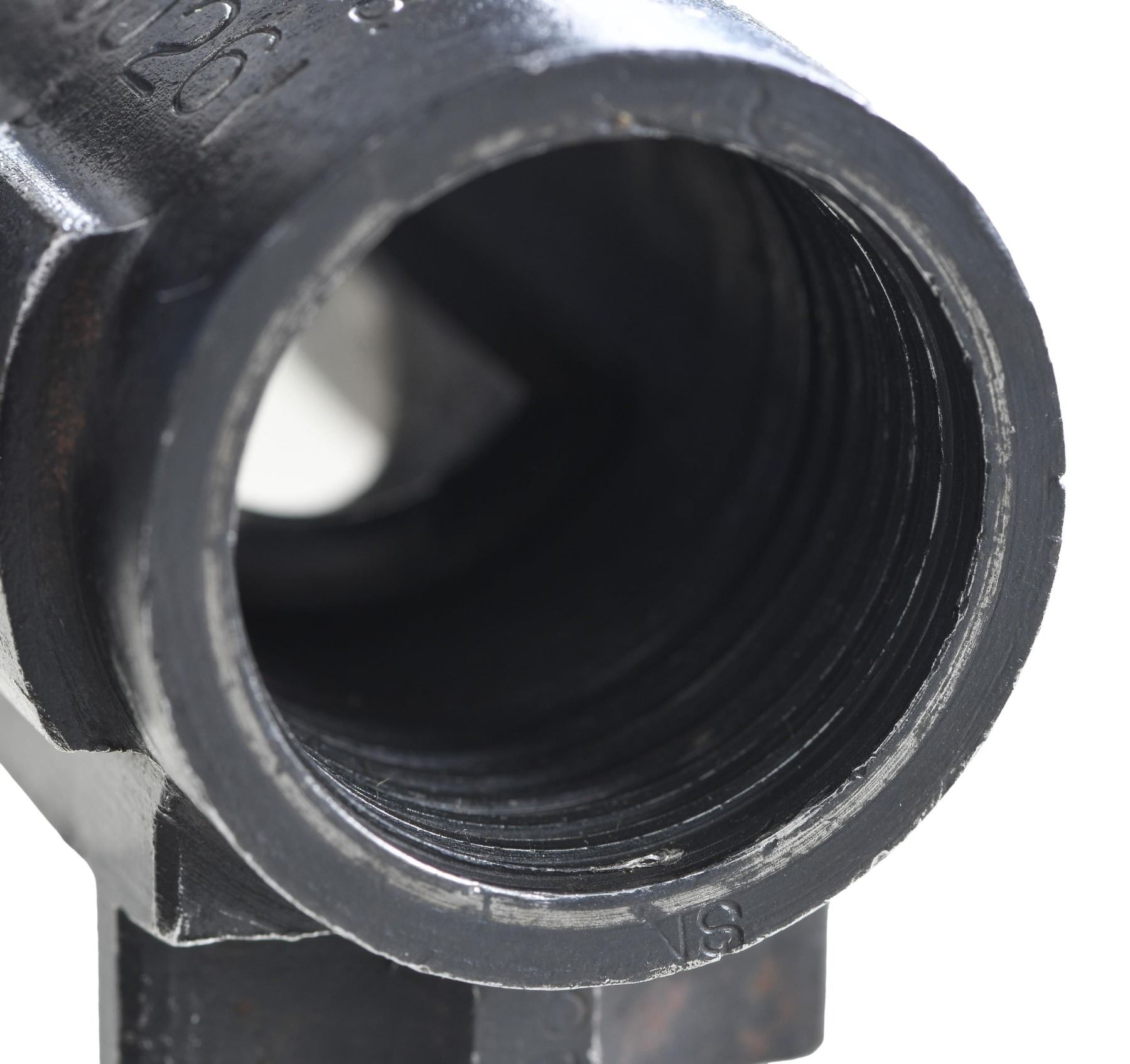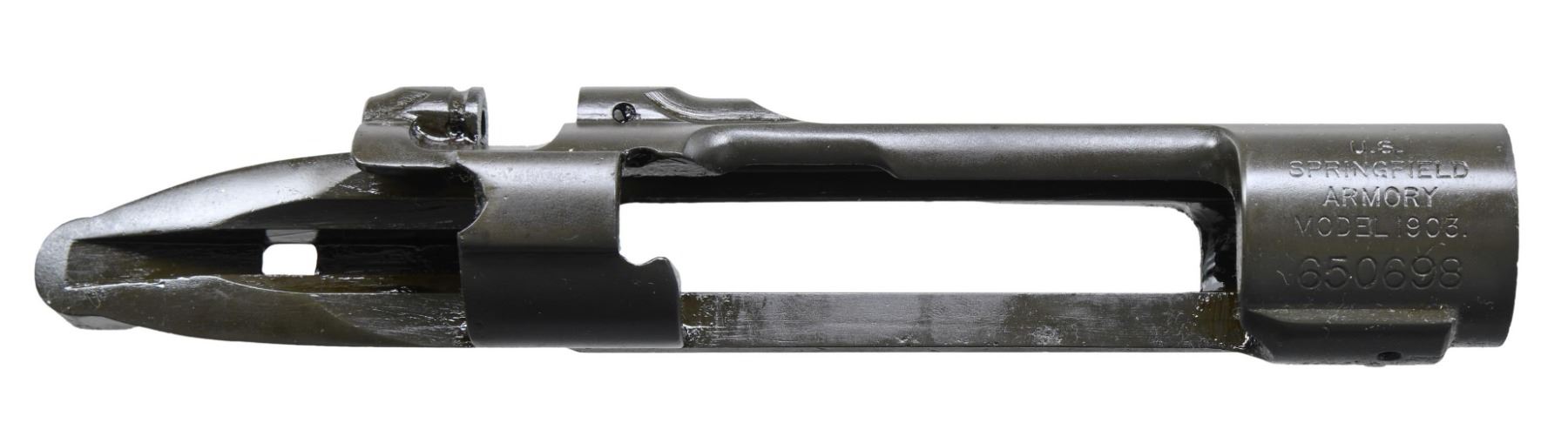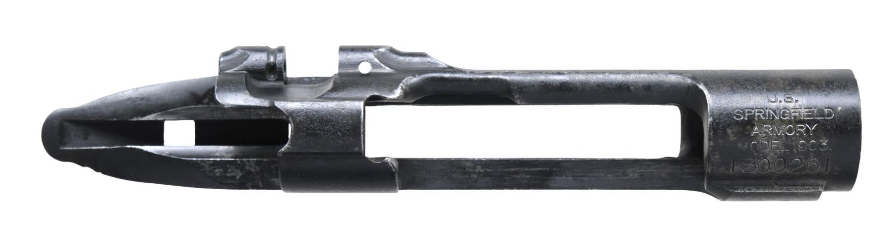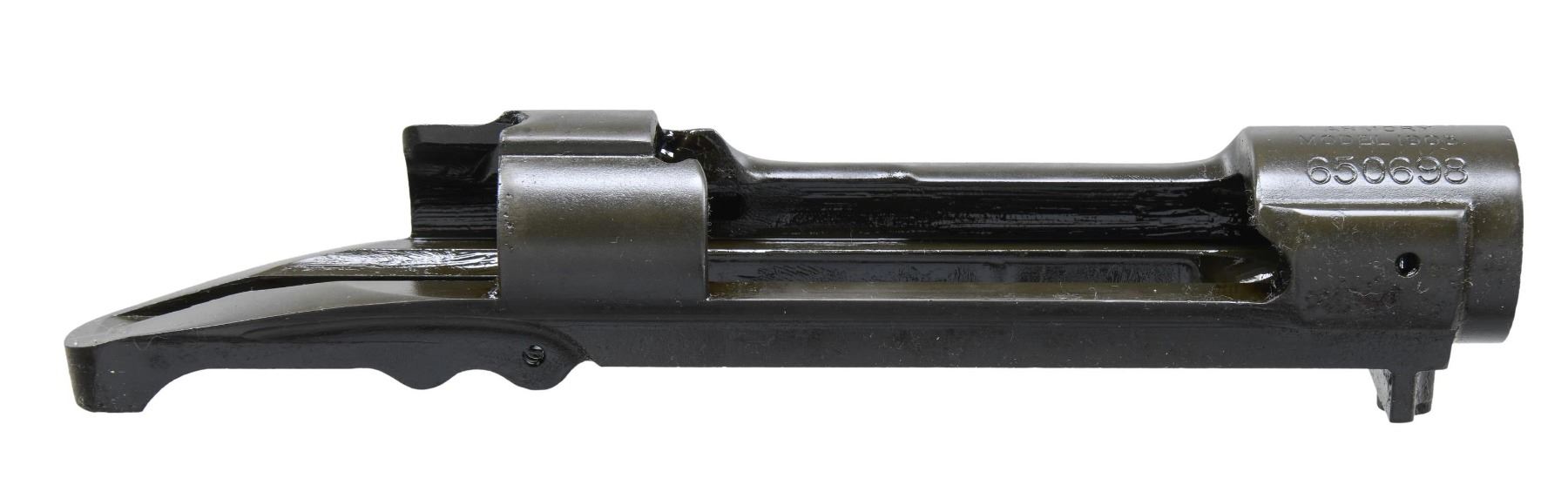 RECEIVERS. No.1: S# 1300261. Receiver produced in 1928. Constructed from nickel steel as evidenced by the "NS" marking at the forward edge of the receiver ring. Receiver contains no additional parts. Hatcher hole is not present. CONDITION: receiver has been cleaned over moderately worn arsenal rework finish. (25-3004/RW). No.2: S# 650698. Receiver produced in 1915. Hatcher hole is not present. Receiver contains no additional parts. CONDITION: receiver has a worn appearance w/ areas of moderate pitting notable on the raised boss at the right forward end of the receiver ring. (25-3007/RW). No.3: S# 1518060. Receiver manufactured between 1937 & 1939 w/ Hatcher hole. Receiver contains no additional parts. CONDITION: receiver retains nearly all of its professional blue refinish over scattered light pitting & light wear. (25-3010/RW). ALL MODERN. $300-500.