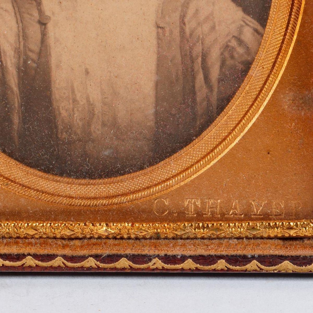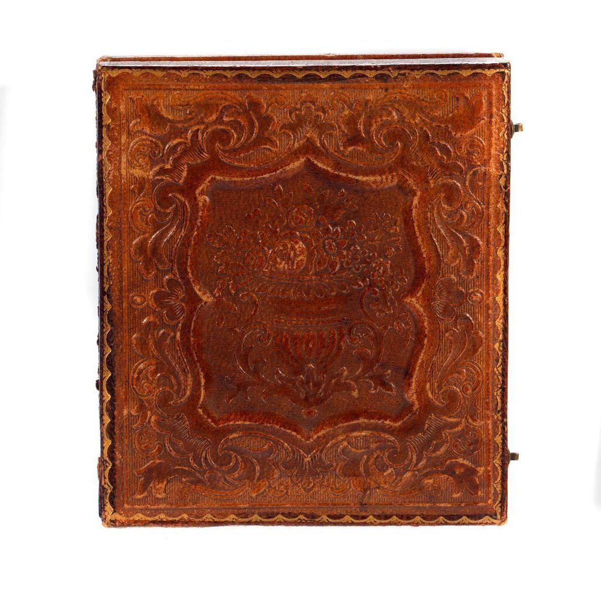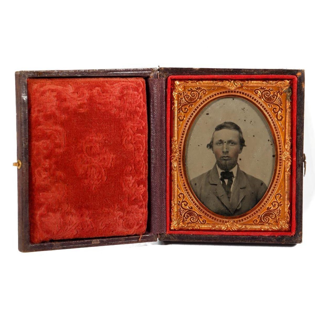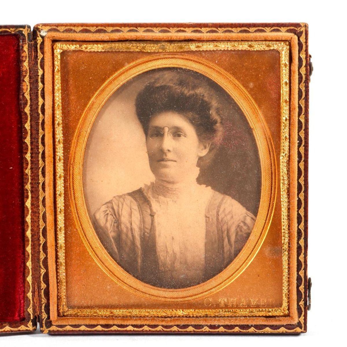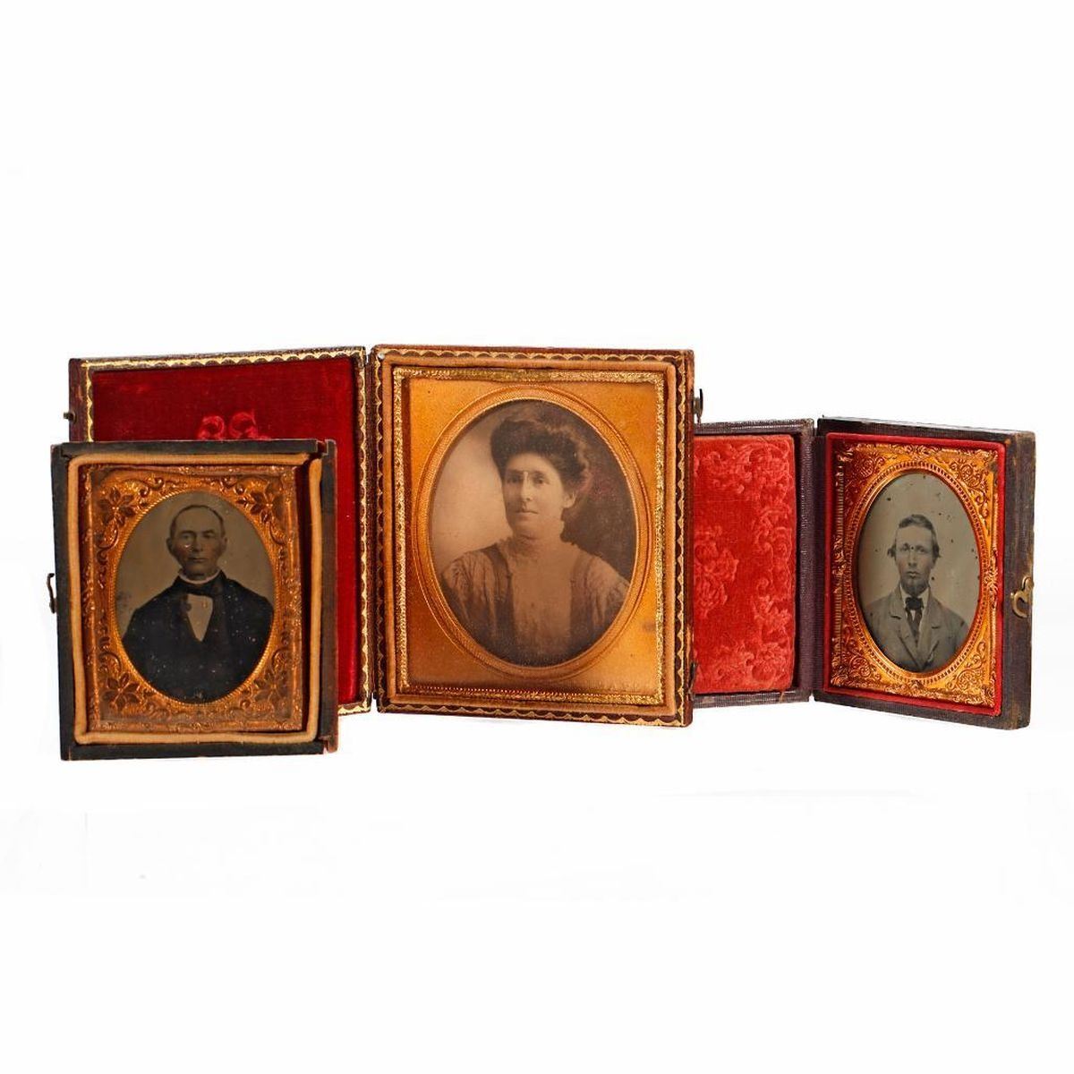 The group is comprised of two tintypes in embossed leather cases (one partial), one depicting a young bearded man, the other an older man in black, each with tinted cheeks; approx. 2 7/8in. x 2 3/8in. Condition: One tintype has dark spotting, the case with wear and old repair; the other tintype has spots of wear and surface scratches and is missing the cover portion, missing leather, with one side coming detached. Together with a paper photograph of an Edwardian woman wearing spectacles, in an embossed and gilt leather case; 3 5/8in. x 3 1/8in. Condition: Wear to case, loose at leather hinge. This lot and the other Chapman-related items offered in this sale were part of a collection of papers and ephemera related to the Edward Mortimer Chapman (1862-1952) family, including his first wife Isabel Northrop Chapman (1864-1920), and second wife, Louise Wadsworth Jones Chapman (1873-1959). Edward M. Chapman was a Connecticut pastor, academic, and author, and a descendant of Robert Chapman, one of the first settlers of Saybrook, Connecticut (c. 1635).