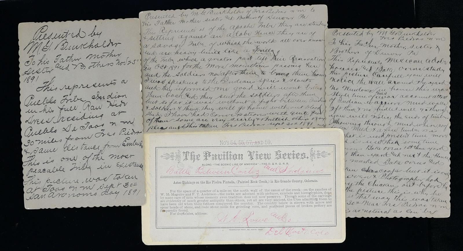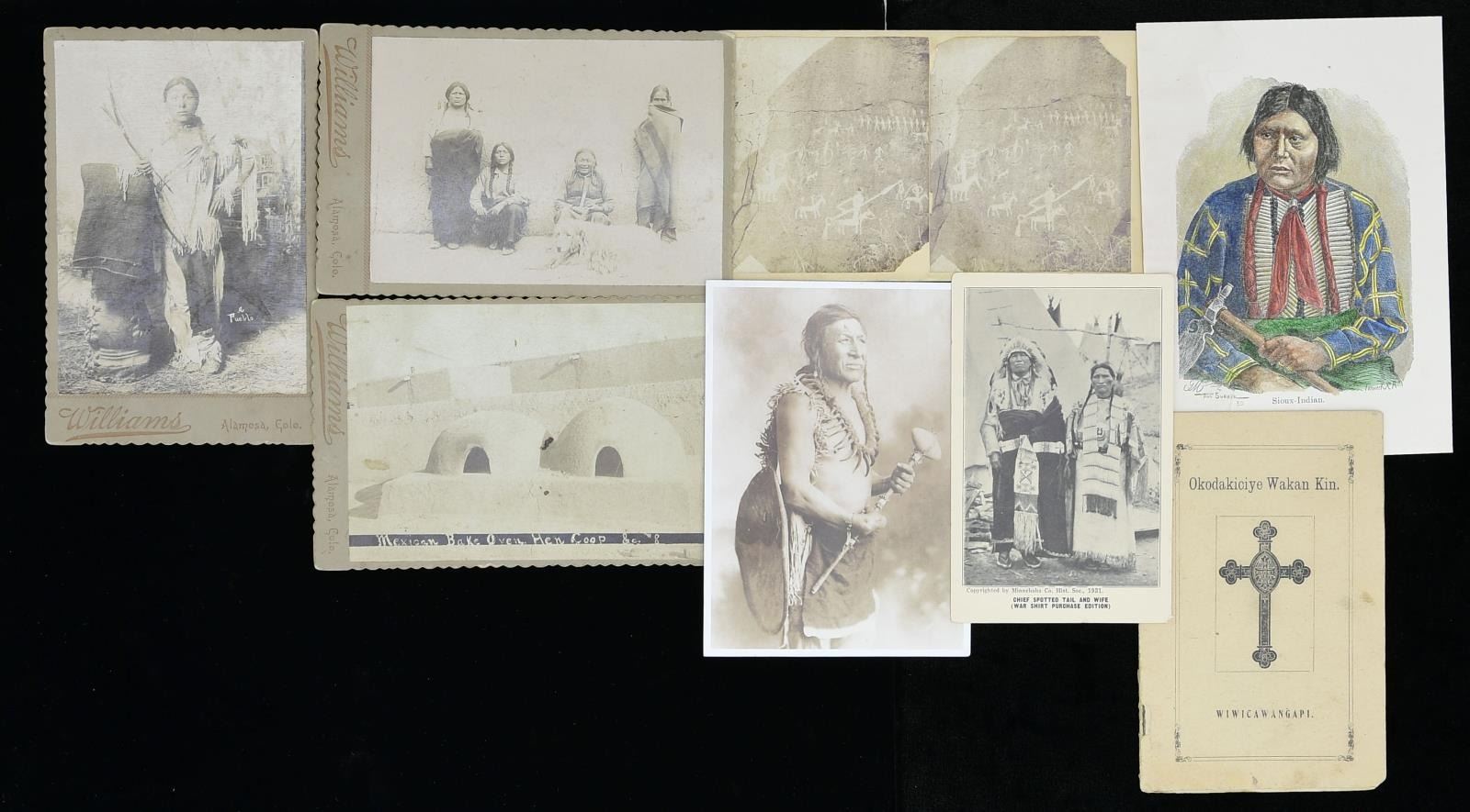 1) Cabinet card of Pueblo brave posed with bow & arrows, presentation on back states photo taken 1891 in Taos. 2) Cabinet card of Apaches, presentation on back dated Sept. 30, 1891. 3) Cabinet card of Adobe Ovens, taken Sept 30 [1891]. 4) Stereo view of pictographs at Rio Piedra Pintada, Colorado. 5) 1918 dated religious tract written in Dakota and English, 18 pages, published Forest City, SD. 6) 3 other images of Native Americans, 2 postcards, and one "Paul Suber" signed hand colored engraving of "Sioux-Indian" with pipe tomahawk. CONDITION: good-very good overall. PROVENANCE: From the Lifelong Collection of Glen E. Mattox. (02-18770/JS). $800-1,200.