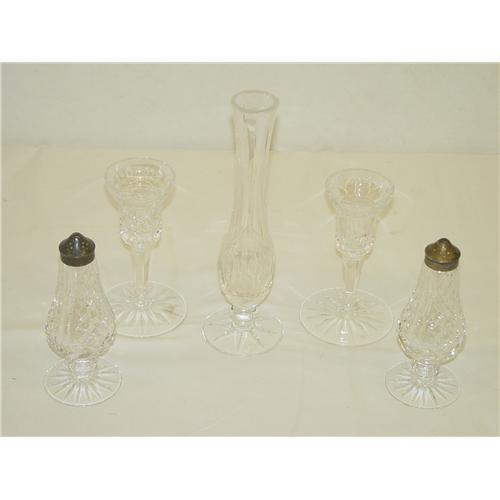 GROUP OF WATERFORD CRYSTAL TO INCLUDE 9 1/4" BUD VASE, PR. 5 1/2" CANDLESTICKS & PR. 6" SALT & PEPPER SHAKERS (PLATING LOSS TO LIDS)-ALL MARKED ON BASE W/ ACID STAMPS - WEAR;