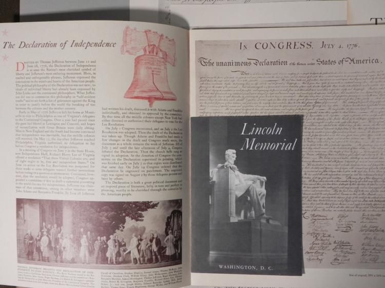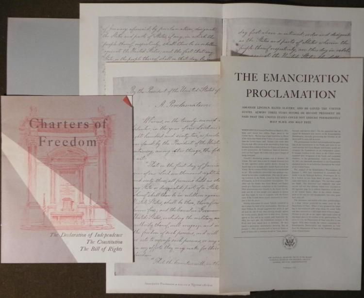 HERE IS A GROUPING OF UNITED STATES DOCUMENTS CIRCA 1960. THEY ARE THE EMANCIPATION PROCLAMATION, DECLARATION OF INDEPENDENCE, AND THE BILL OF RIGHTS--CONSTITUTION. THE EMANCIPATION PROCLAMATION IS APPROX 12X20" AND THE OTHERS ARE SMALLER. THE CORNER IS SOILED ON THE EMANCIPATION PROCLAMATION. * *