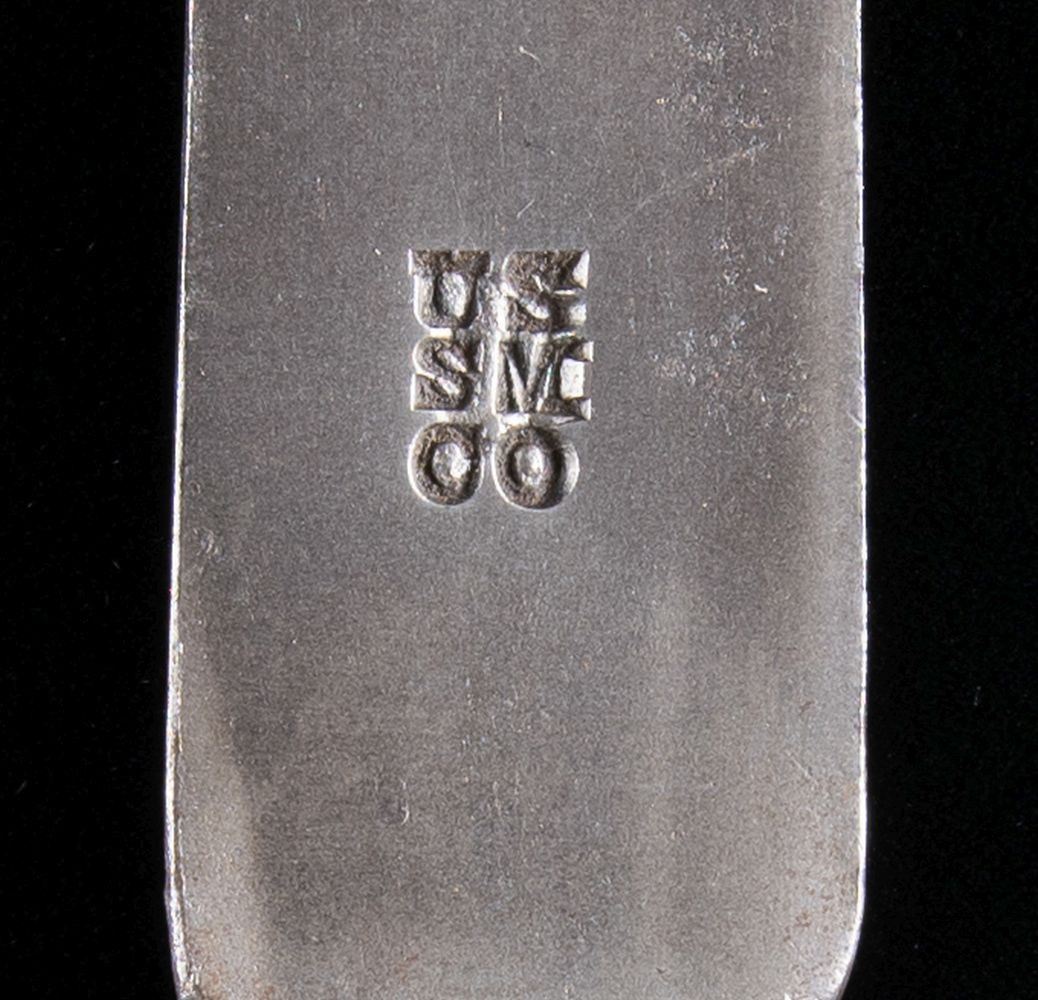 The Model 1816 socket bayonets have unique features which set them apart from their predecessors including the T shaped mortice in the 3" socket & the ground face flute w/ its nominal length of 9". On a large number of Model 1816 bayonets, the inspector's initials accompany the "US" at the rear of the blade face. Bayonets were intended to be produced in groups of 2,400 each & utilized a letter for each 100 bayonets. This letter may or may not be present. No.1: 15 3/4" blade. 18 7/8" overall. Bright finished bayonet has 9" flute. Blade is marked on the rear face "US / SE". Neck is marked on right side w/ tiny "A" & what appears to be a partial "H". CONDITION: bayonet has been very lightly cleaned, but exhibits light wear, scattered small dents & small spots of oxidation. / No.2: 15 3/4" blade. 19" overall. Blade has 9" face flute. Blade is marked "U.S. / N.S.". The "N.S." may refer to the early noted gunmaker "Nathan Starr". Neck is marked on right side "AH". "20C" appears at the front end of the mortice. CONDITION: bayonet turning overall gray & patina w/ several spots of shallow pitting & shows average use. / No.3: 15 7/8" blade. 19 1/8" overall. Fluted blade face marked at rear "US / WL". 6 appears at both ends of socket mortice. CONDITION: blade is turning gray & patina w/ areas of light oxidation. Shows normal wear. / No.4: 15 3/4". 19" overall. Blade w/ fluted face is marked "US / SM / CO" indicating the inspector was Stillman Moore. Socket is marked on the right side "W 58". CONDITION: bayonet has turned an overall gray w/ the beginning of patina on the socket & has normal wear. / No.5: 15 3/4" blade. 19" overall. Fluted blade is marked "US / CB". CONDITION: blade is turning overall gray & patina w/ areas of light oxidation & normal wear. / No.6: 15 5/8" blade. 19" overall. Fluted blade is marked "US / EH". Marked w/ "2" on right side of socket. CONDITION: bayonet has turned gray & patina w/ areas of oxidation & moderate pitting. Rear of socket has slightly raised edge & socket shows welding marks. / No.7: 15 5/8" blade. 19" overall. Blade w/ flute is marked at rear of face "L / US / JB / C / 10". Socket is marked on the side "W / a". CONDITION: bayonet has turned a pleasing light brown patina w/ less than normal wear. / No.8: 15 3/4" blade. 18 7/8" overall. Fluted blade marked at rear "US / JB". CONDITION: face of blade has notable de-laminated area on face approximately 4 1/2" behind point & should be handled w/ care. Bayonet has turned an overall dark patina w/ overall oxidation & pitting throughout. / No.9: 15 7/8" blade. 19 1/8" overall. Fluted blade is marked at rear "US / WR". CONDITION: well-worn bayonet has a dark patina & extensive pitting throughout. / No.10: 15 3/4" blade. 19" overall. Fluted blade is marked at rear "US / JB". CONDITION: bayonet is a dark patina w/ extensive shallow pitting throughout w/ notable wear including the ends of socket. (02-24189/RW). NON-GUN. $1,000-1,500.