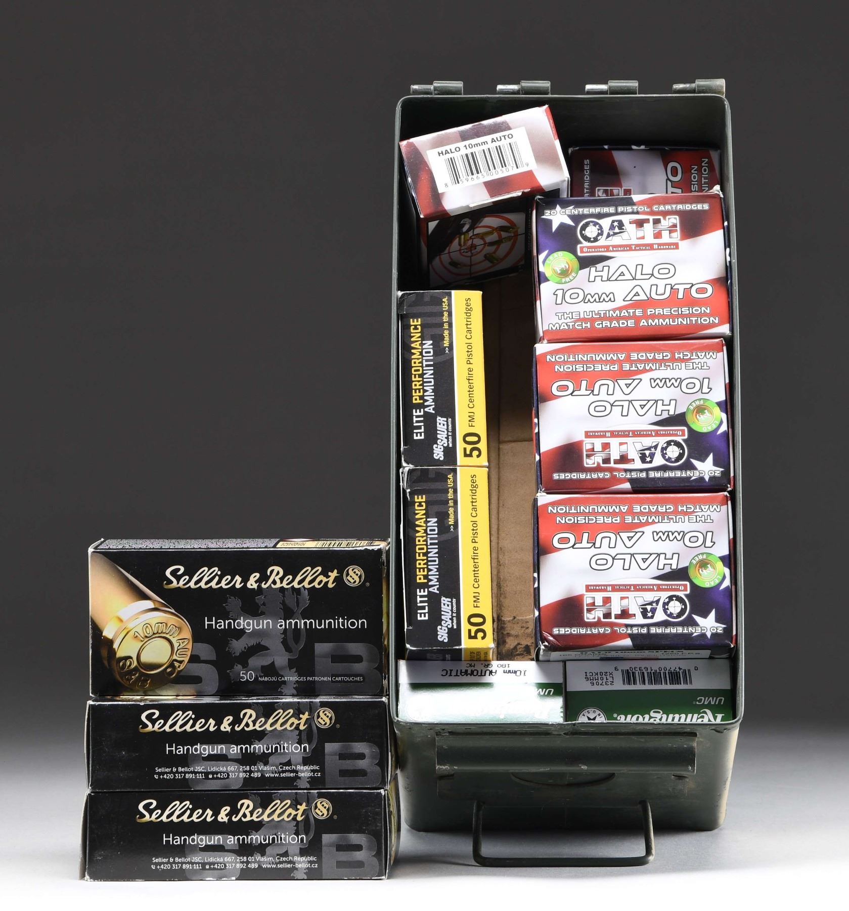 3 BOXES - 150 rds. of Sellier & Bellot 180 gr. FMJ. 1 CASE SEALED - 250 rds. of 180 gr. FMJ. 2 BOXES - 80 rds. of Rem. 180 gr. MC. 3 BOXES - 135 rds. of Sig Sauer 180 gr. FMJ. 5 BOXES - 85 rds. of Halo 165 gr. MATCH. Lot comes with ammo can. CONDITION: boxes appear in very good condition; ammo appears serviceable. (02-24036/MD). AMMO. $200-400.
