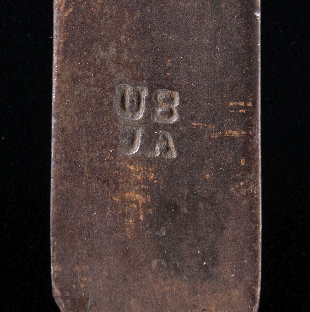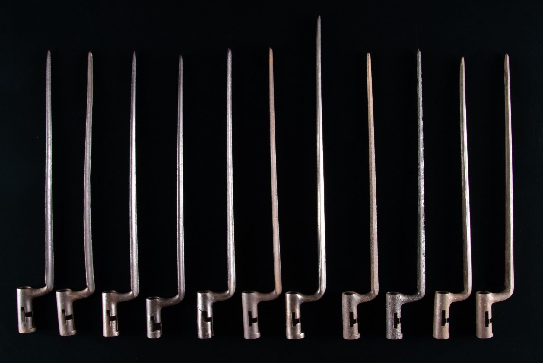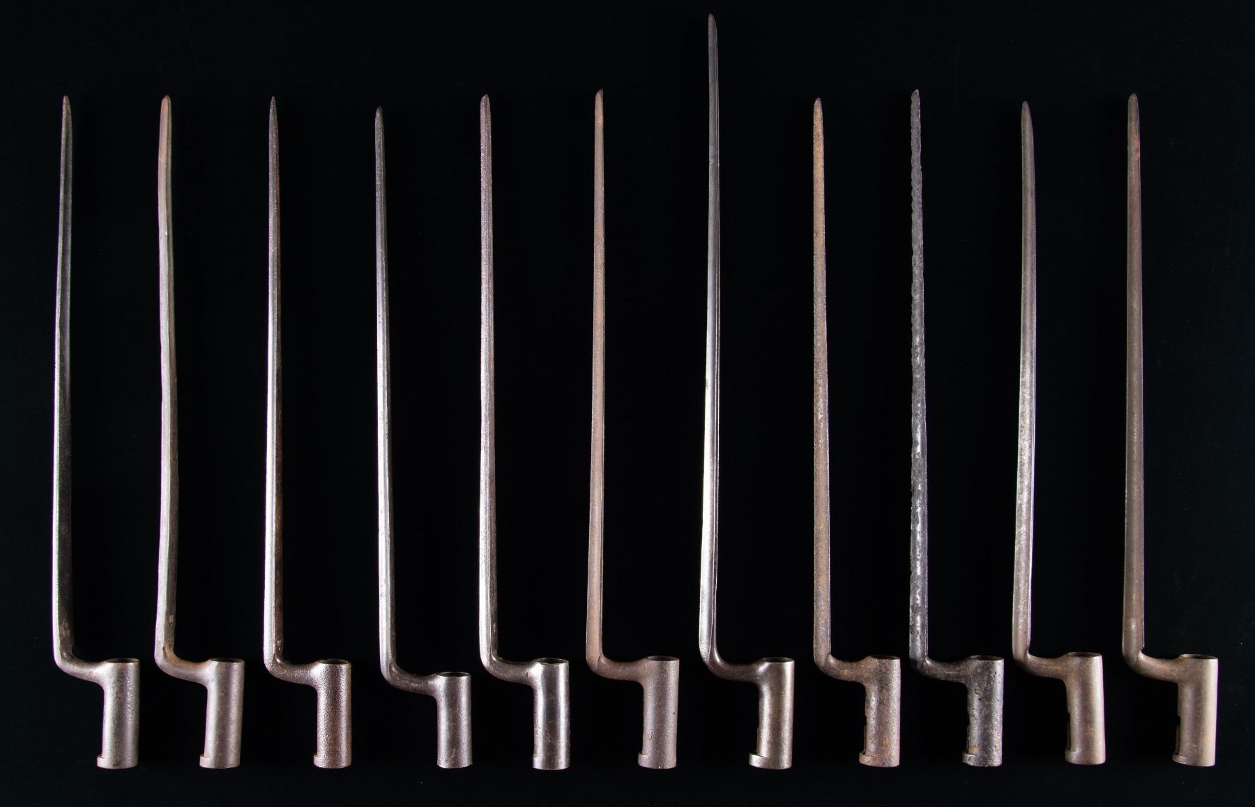 No.1: U.S. Musket Model 1862 Hughes & Phillips Conversion Socket Bayonet. 18" blade. 21 3/8" overall. Full fluted blade is marked on top "US". Socket is 1816 type w/o locking ring. CONDITION: bayonet has normal wear, turning gray & patina w/ areas of fine pitting throughout. / No.2: Model 1816 Bayonet. 15 3/4" blade. 18 3/4" overall. Fluted blade is marked "US / HB" on top rear. Socket has been modified by shortening to remove bridge & the mortice enlarged. CONDITION: bayonet turning gray & patina w/ oxidation, extensive wear & shallow pitting throughout. / No.3: Model 1816 Socket Bayonet. 15 7/8" blade. 19 1/8" overall. Fluted blade is marked at top rear "US / SC". CONDITION: bayonet has seen hard service w/ wear, oxidation & pitting throughout. / No.4: Model 1816 Socket Bayonet. 15 3/4" blade. 19" overall. Fluted blade is marked "US / JR" at top rear & additionally marked "B". Right side of socket marked "G / f" & "20". CONDITION: bayonet has heavy wear w/ extensive oxidation & shallow pitting. Finish has been enhanced w/ cold blue. Socket has notable split at forward end of T mortice. / No.5: Model 1816 Socket Bayonet. 15 5/8" blade. 19" overall. Fluted blade is marked "US" at top rear & marked "8" on right side of socket. CONDITION: blade has been ground on both top edges & is slightly distorted. Metal has turned overall patina w/ oxidation. / No.6: Model 1816 Socket Bayonet. 15 1/2" blade. 18 5/8" overall. Fluted blade marked at rear "US / JA". CONDITION: bayonet has turned gray & patina w/ normal wear & scattered spots of oxidation & fine pitting. / No.7: Model 1816 Socket Bayonet. 15 5/8" blade. 19" overall. Fluted blade is marked at top rear "US / SM". CONDITION: bayonet has turned overall patina w/ wear & fine pitting. Tip has notable de-lamination for approximately 1". / No.8: Model 1816 Socket Bayonet. 15 5/8" blade. 19" overall. Fluted blade is marked at top rear "W / US". CONDITION: blade has been bent slightly upward. Bayonet has turned overall gray & patina w/ wear & areas of shallow pitting. / No.9: Model 1816 Socket Bayonet. 15 1/2" blade. 18 3/4" overall. Fluted blade is marked on top "U / US". CONDITION: blade is heavily weathered w/ dark patina & extensive pitting throughout. / No.10: Model 1816 Socket Bayonet. 15 3/4" blade. 19" overall. Fluted blade is marked "US". CONDITION: bayonet has been cleaned, showing wear & extensive pitting throughout. / No.11: Model 1816 Socket Bayonet. 15 3/4" blade. 19 1/8" overall. Fluted blade marked at rear "US / NM". CONDITION: bayonet is in relic condition w/ heavy wear, oxidation & pitting w/ extensive loss of metal on the blade. (02-24190 & 02-24200/RW). NON-GUN. $1,000-1,500.
