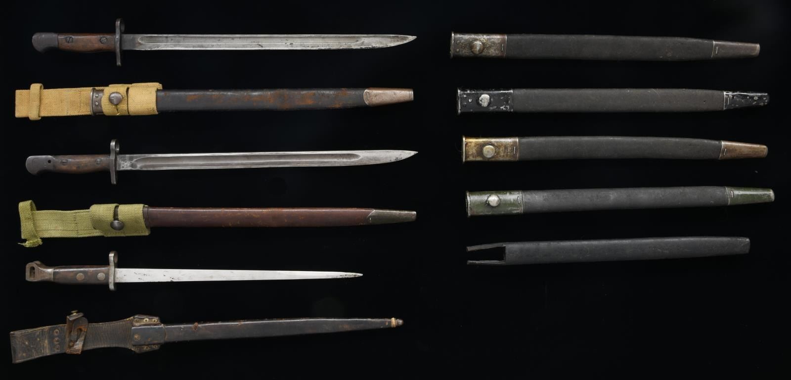 BRITISH 1907 SCABBARDS. 1) Dutch Model 1895 Mannlicher 13 7/8" blade. Approx. 4 1/2" false edge. Blade is marked "HEMBRUG" on left ricasso & crown over "E" on right ricasso. S# on cross guard. Smooth walnut grips secured by flush rivets. Latch components are not present in pommel. Leather scabbard w/ attached frog. 2) Australian Model 1907 bayonet w/ 17" fullered blade. Blade is marked on left ricasso "2 42". Right ricasso marked "MA" Two broad arrows, 2 view marks "X". Straight cross guard. Smooth hardwood handles retained by 2 screws. Birdshead pommel. Leather scabbard w/ steel throat & tip. Green web frog. 3) British Model 1907 bayonet. 16 5/8" fullered blade. Blade marked on left ricasso crown "1907 11'09" / "SANDERSON". Right ricasso has 3 view marks. Ricasso & pommel have opposed arrows indicating sold out of service. Straight cross guard. Smooth hardwood grips. Birdshead pommel. Leather scabbard w/ metal throat & tip. Khaki web frog date "1941". 4) 4 Model 1907 leather scabbards w/ metal throat & tip. 5) 1 leather scabbard incomplete w/out throat & tip. CONDITION: item are complete except as indicated & have wear, scuffing, oxidation & handling marks throughout. (02-19611-8/RW). $150-250.