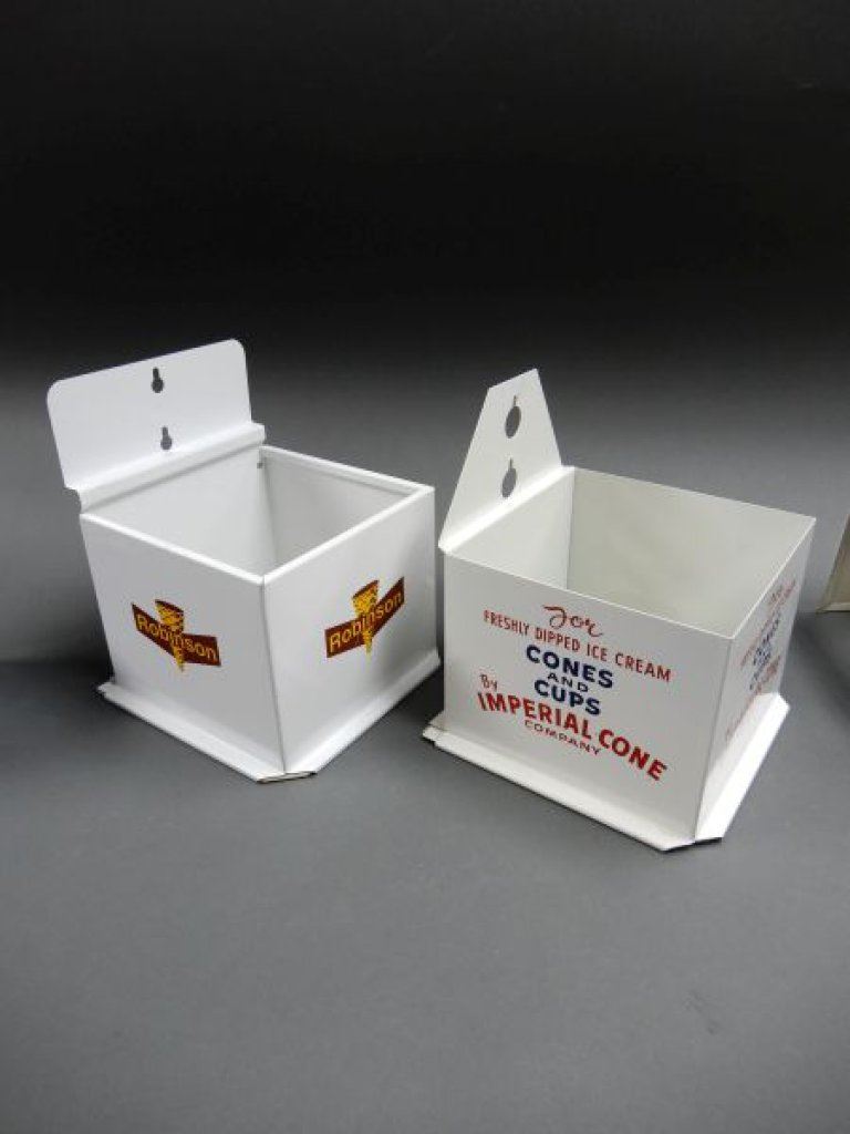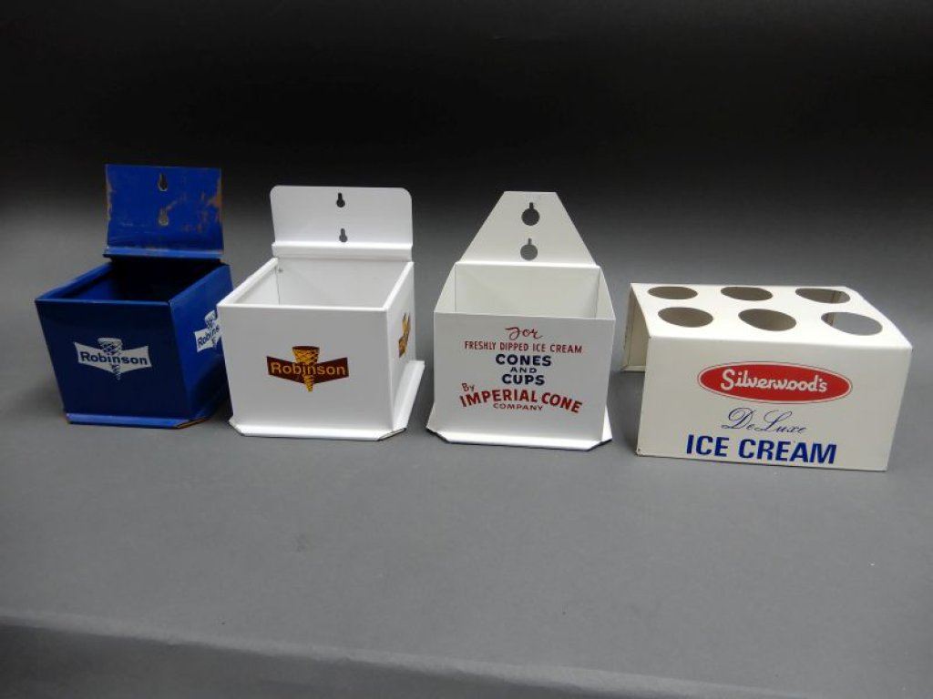 GROUPING OF 4 ICE CREAM DISPENSERS SILVERWOOD'S 6 CONE HOLDER- IMPERIAL CONE- 2 ROBINSON LOCATION: SODA SHOP