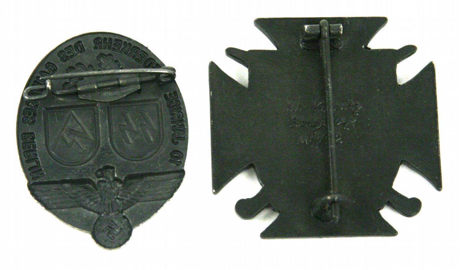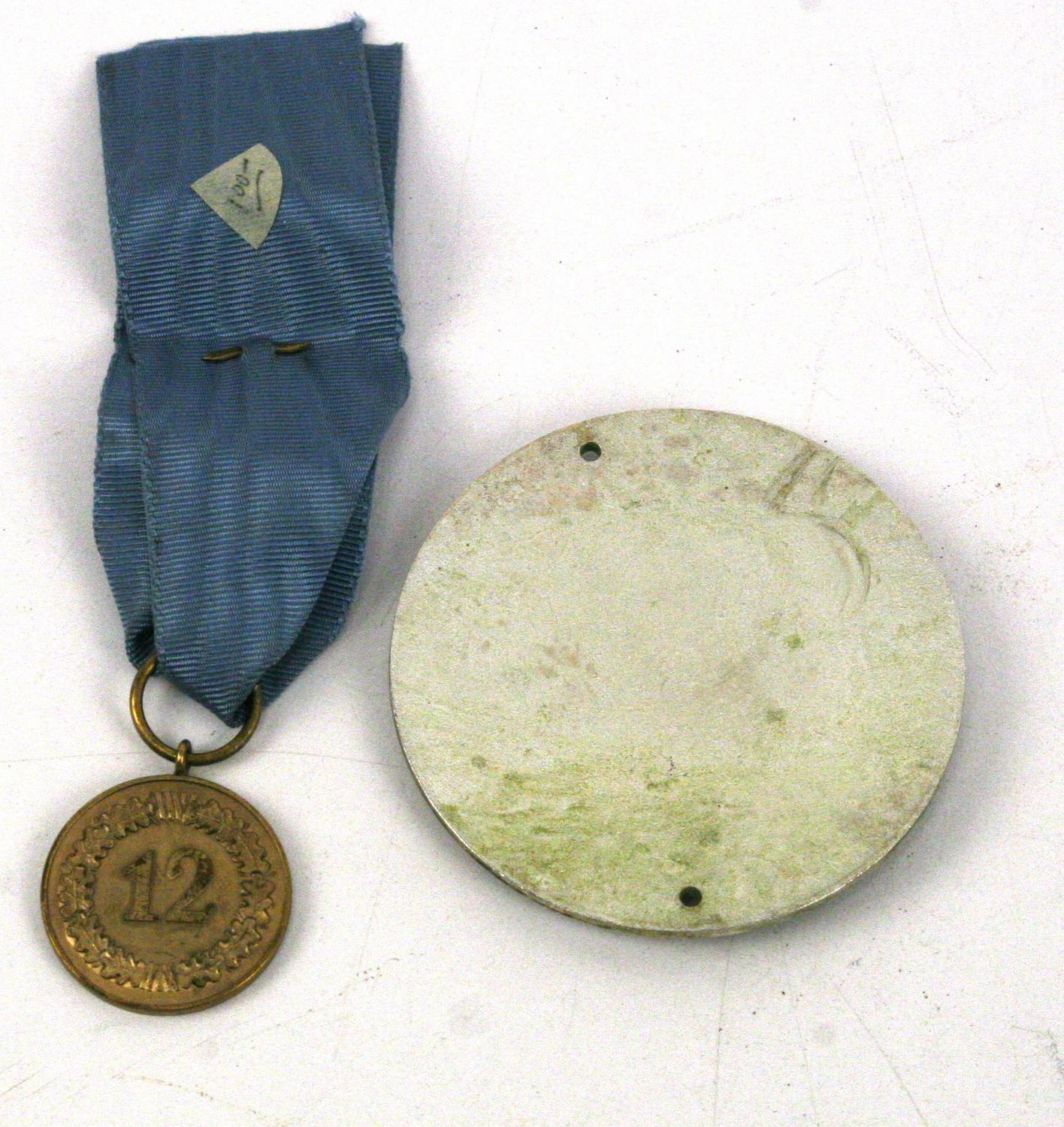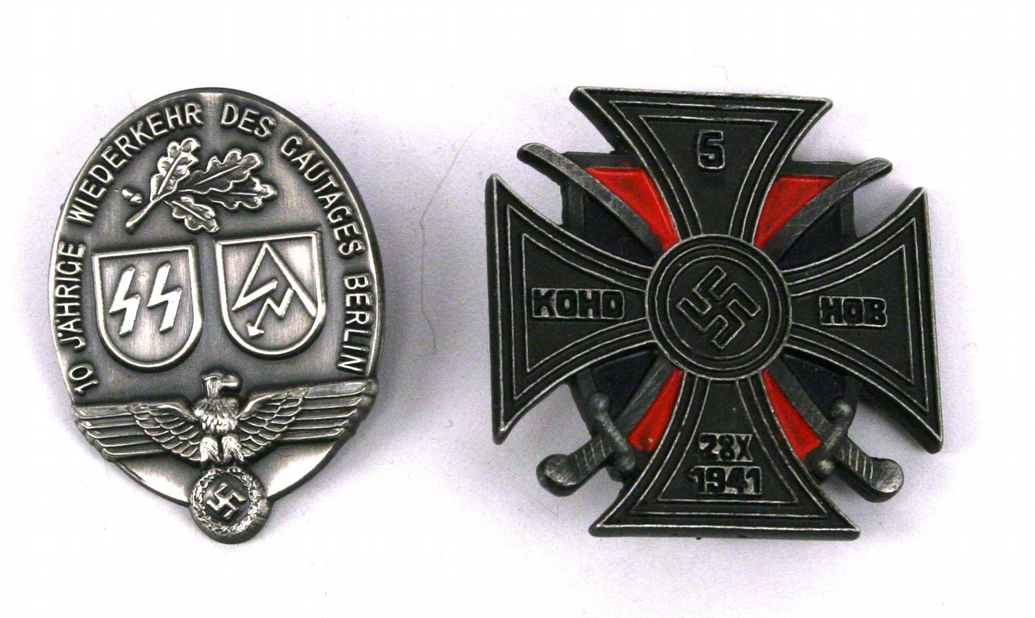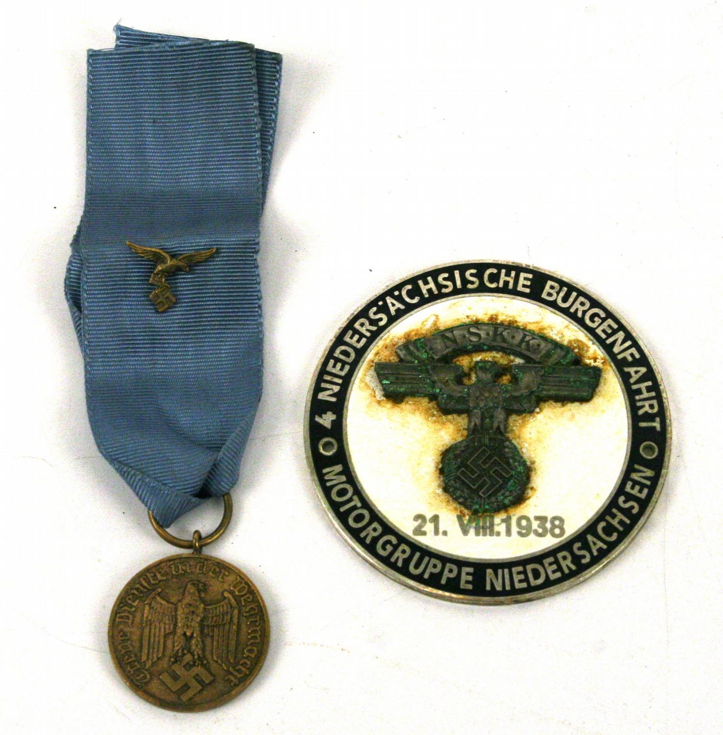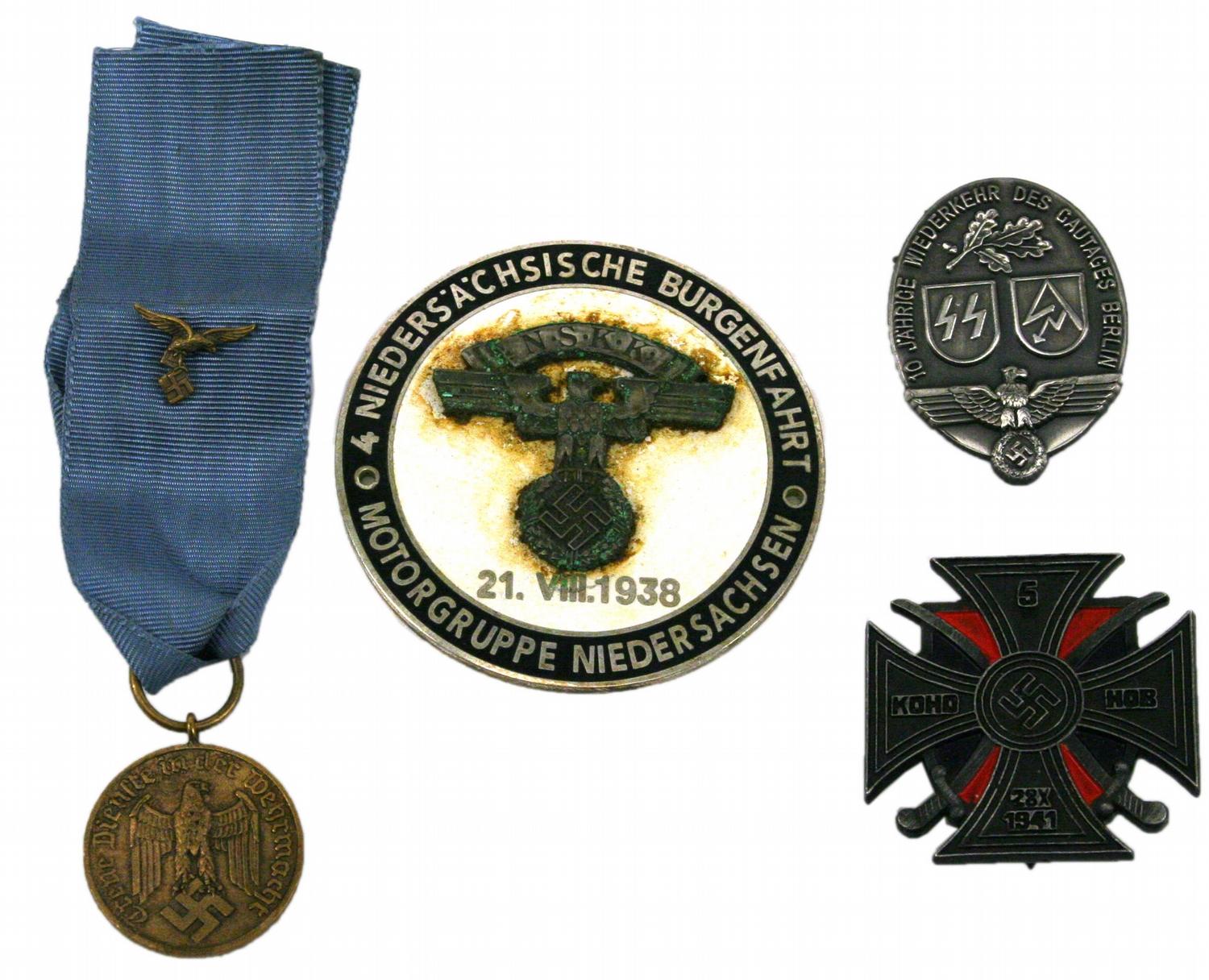 A NSKK car plaque, dated 1938, with some oxidization to party eagle; a Nazi Russian Cossack Badge (possible copy); a Luftwaffe 12 year medal, with ribbon and device, and an SS / SA tinnie.