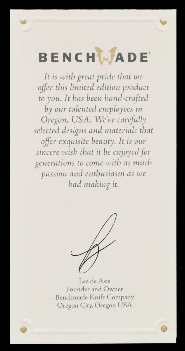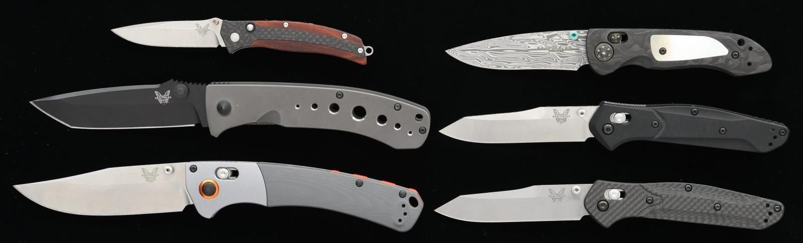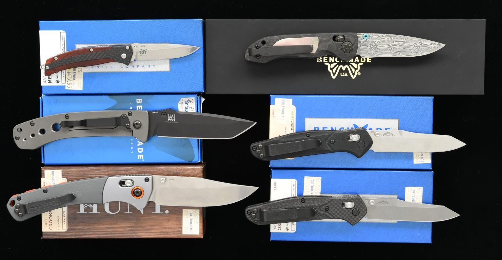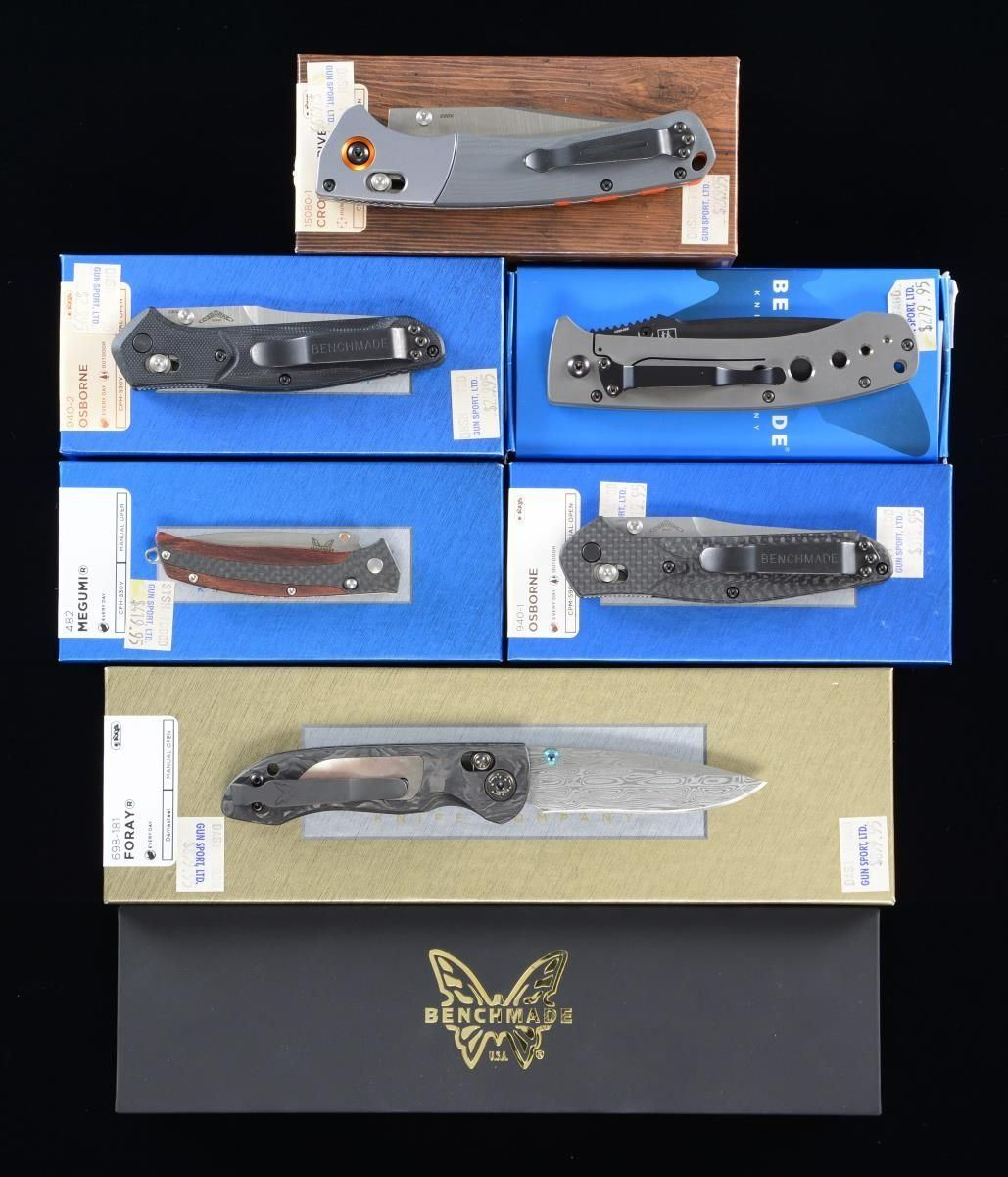 INCLUDING A NUMBERED EDITION FORAY. These Manual Open BenchMade knives are all in factory boxes w/ black nylon sleeves and instruction papers. 1) 1 - 698-181 FORAY EVERYDAY DAMASTEEL knife w/ 3 1/4" Loki Damasteel blade marked on left side w/ BenchMade logo. Axis lock mechanism. Marble carbon fiber grips w/ Mother of Pearl inlay. Official numbered & dated certificate of authenticity. Velvet lined display case w/ black nylon pouch. Gold & silver colored box. 2) 1 - 482 MEGUMI EVERYDAY CPM-S30V knife w/ 2 1/2" blade. Left side has BenchMade logo. Right side marked "S30V" & "NAKAMURA". Gray & maroon composite grip. 3) 1 - 940-1 OSBORNE EVERYDAY OUTDOOR CPM-S90V knife w/ 3 1/2" blade. Left side has BenchMade logo. Right side has "S90V" & Osborne logo. Gray composite grip. 4) 1 - 15080-1 CROOKED RIVER HUNTING CPM-S30V knife w/ 3 7/8" blade w/ BenchMade logo on left side & "S30V" on right side. Gray wood grain grips. Box has brown wood grain coloration. 5) 1 - 940-2 OSBORNE EVERYDAY OUTDOOR CPM-S30V knife w/ 3 1/2" blade. BenchMade logo on left side. Right side has Osborne logo & "S30V". Black composite grips. 6) 1 - 760BK LIFTI knife w/ 4" Tanto style blade. Left side has BenchMade logo. Right side has Lum logo & "CPM-M4". Gray composite grips. CONDITION: near new in factory boxes. Boxes may have slight shop wear, fading & sm. tears. PROVENANCE: the Collection of Gun Sport Ltd. owned by Jon R. Thomas. (02-20783-4/RW). $800-1,200.