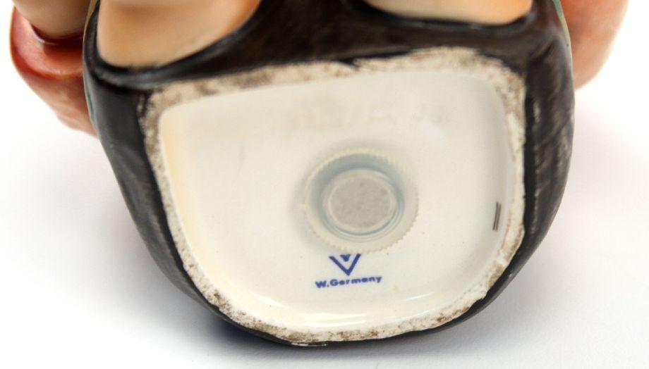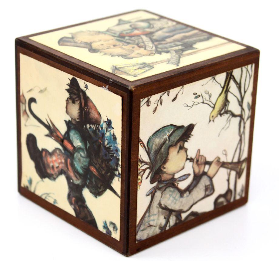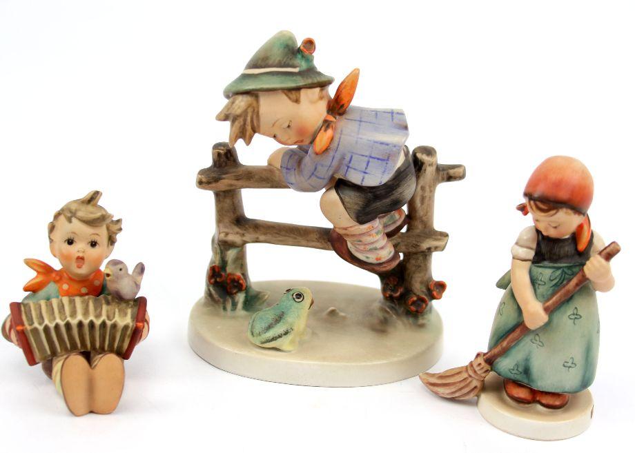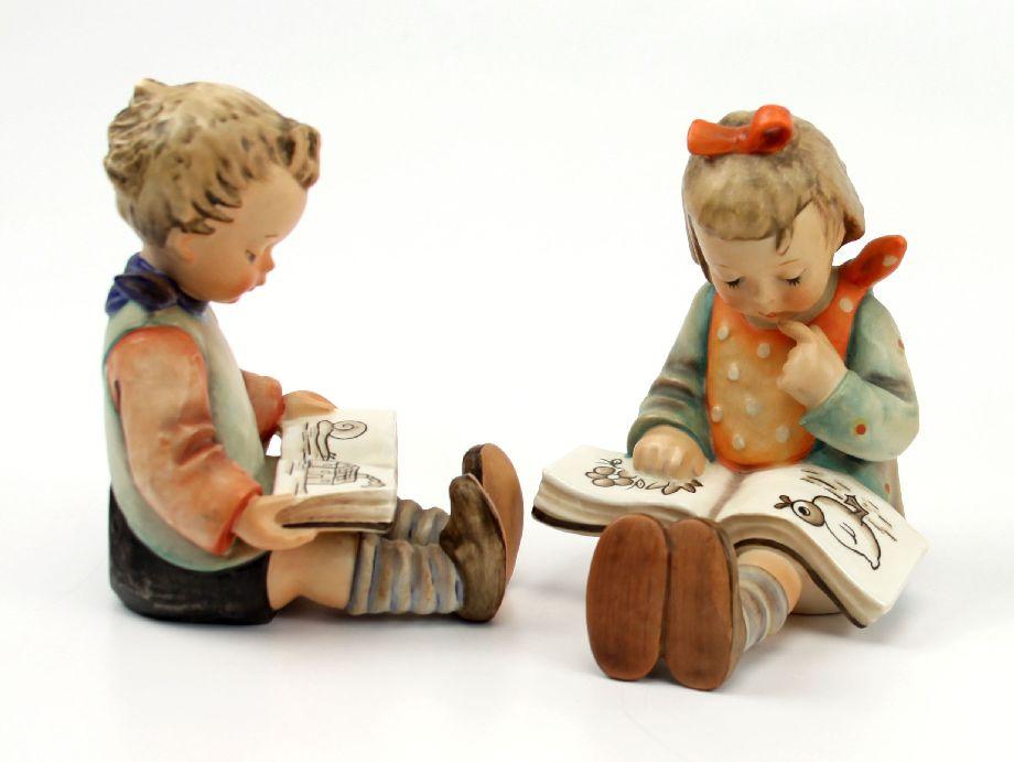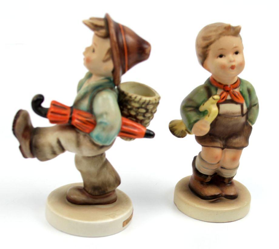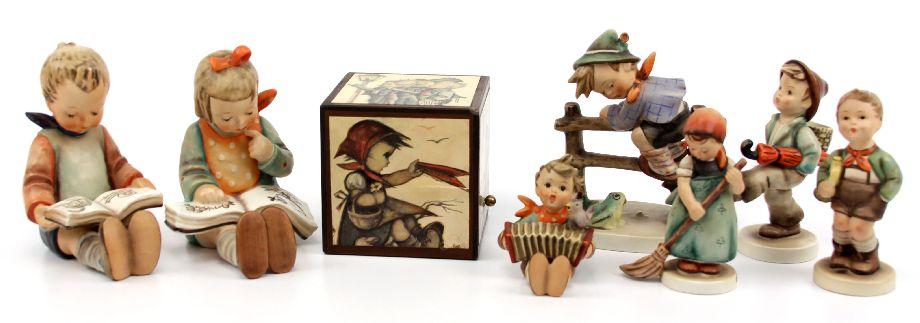 Grouping of seven Goebel Hummel figurines. "Retreat to Safety" with full bee, "Bookworm" bookends, "trumpet Boy # 97 with full bee, "Globe Trotter", "Little Sweeper", "Let's Sing" . All figurines are in very good condition. Also included is a vintage Swiss made Reuge music box featuring Hummel inspired designs.