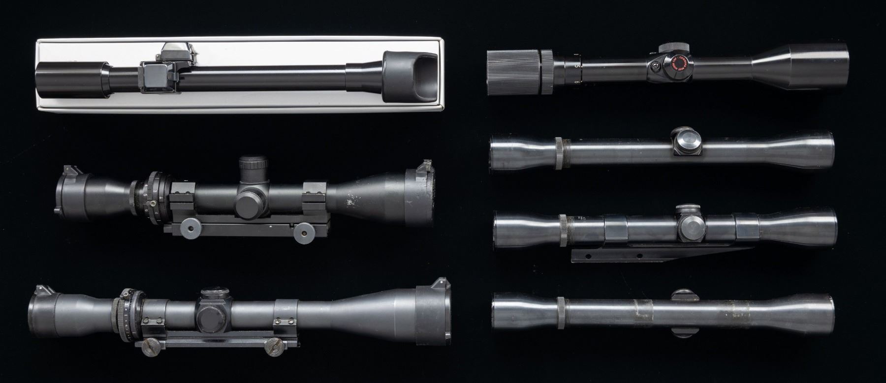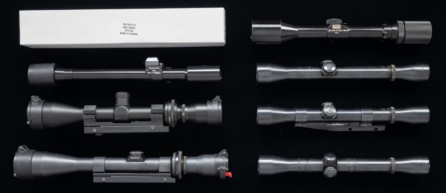 SCOPES. 1) Leatherwood Type tactical 1" Scope. 3-9x40 w/ ranging rings adjustable in meters. Finger adjustable scope turrets. Range-finding reticle. Weaver type mount is marked in script "LEATHERWOOD" & "serial number". Mount is marked underneath "MADE IN CHINA". Flip-up scope caps. CONDITION: scope appears in good condition w/ light wear & handling marks. Optics appear clear & serviceable. 2) Leatherwood Type Scope. Tactical scope has 1" steel tube. Ranging rings are adjustable in meters. 3-9x40. Scope is unmarked. Coin slotted windage & elevation turrets. Weaver rail type mount. Duplex reticle w/ range-finding crosshair. Butler Creek flip-up scope caps. CONDITION: scope has moderate wear & handling marks throughout. Optics appear clear & serviceable. 3) Reproduction M84 Sniper Scope. Quality Taiwan made replica is equipped w/ rubber eyepiece & sliding sunshade. Scope has gloss black finish. Nomenclature plate on right side is marked "TELESCOPE / M84 / SERIAL NO. boxed WO514". Adjustment covers are present. Post & crosshair reticle. Also includes cardboard shipping box. CONDITION: scope appears as new new in original box. 4) Weaver K4 1" Steel Tube Scope. 4x. Crosshair reticle. Scope is equipped w/ Weaver long side-mount base & rings. Base has been modified on the side-rail to accommodate other brands of scope w/ encircled turret bases. CONDITION: scope retains most of its original blue finish w/ very light wear. Optics appear clear & serviceable. 5) Weaver K4 1" Steel Tube Scope. Post & crosshair reticle. CONDITION: scope has numerous wear & fitting marks. Optics appear clear & serviceable. 6) Weaver K4 1" Steel Tube Scope. Post & crosshair reticle. CONDITION: scope has considerable loss of finish & deep ring marks. Optics appear slightly cloudy, but serviceable. 7) Bushnell Scope Chief. 3x-9x. Command post reticle. 1" alloy tube. 50mm objective lens. Gloss black finish. CONDITION: scope has light wear & handling marks. Optics appear clear & serviceable. (02-24538-2/RW). NON-GUN. $500-700.