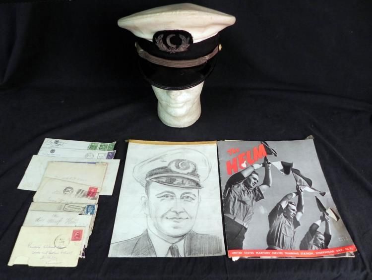 GROUPING OF A WWII ARMY TRANSPORTATION SERV PETTY OFFICER STEWARD-VISOR, SKETCH ++---GREAT GROUPING OF A WWII ARMY TRANS PETTY OFFICER INCLUDING HIS VISOR WITH THE UNIQUE CRESCENT MOON IN WREATH, SEVERAL LETTERS FROM THE 40'S, A CHARCOAL SKETCH OF THE GI WEARING THE VISOR, THE HELM 1943 FROM THE US MARITIME SERVICE TRAINING STATION IN SHEEPSHEAD BAY/BROOKLYN NY--SOME SOILING TO VISOR