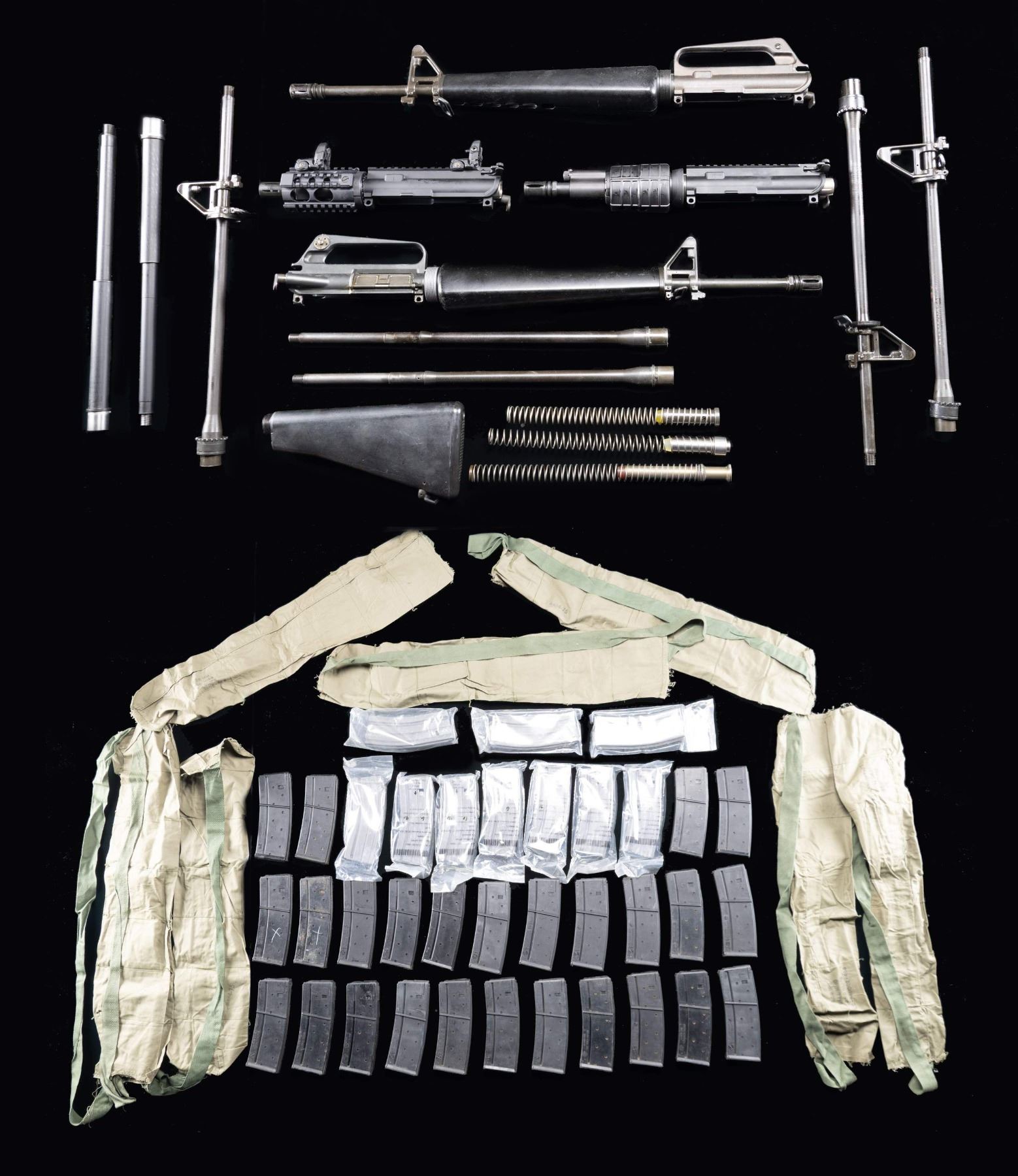 A nice lot of AR-15 / M16 related parts & accessories including the following. 1) 1 complete 4" barreled 5.56x45mm DGI flat top upper receiver. Threaded barrel, terminated w/ slotted flash hider. 4" quad rail currently hosting MagPul MBUS flip up, protected post front sight. MagPul MBUS flip up, dual aperture rear peep sight. Brass deflector & teardrop forward assist. M16 profile chrome bolt & carrier. Complete w/ charging handle. No obvious indication of prior use. Bright bore w/ strong rifling. 2) 1 complete 7.5" barreled 5.56x45mm Adams Arms piston driven flat top upper receiver. Threaded barrel, terminated w/ A2 style flash hider. 3.5" round carbine handguards. Brass deflector & teardrop forward assist. M16 profile chrome bolt carrier. Complete w/ charging handle. No obvious indication of prior use. Bright bore w/ strong rifling. 3) 2 M16A1 20" barreled upper receivers. A1 flash hiders. Triangular, beavertail handguards retained w/ strait delta rings. Marked w/ "C" & "MP". Teardrop forward assist. No brass deflector. Protected post front sight / gas block / bayonet lugs. Windage adjustable, dual aperture rear peep sights integral to carry handle. Sling swivels present. Bright bores w/ strong rifling. 4) 5 surplus barrels. 20" w/ threaded muzzles. 3 complete w/ barrel nuts & front sight / gas block / bayonet lug. 3 are marked "MP" & "12". 1 is marked "CMP B". 1 marked "M" w/ "VP" inside a triangle, signifying "verified proof" as manufactured between 1963-1967, & "12". Bores are bright w/ descent rifling. 5) 2 carbine length barrels measuring 16.5" in length. 1 marked "GLFA 5.56 NATO 1:7" w/ the other marked "GLFA .223 WYLDE 1:7". Still wrapped in blue plastic netting w/ no outward sign of prior installation or use. 6) 3 buffers w/ recoil springs. 2 are carbine length & 1 is rifle length. 7) 36 total 30 rd. mags. 10 aluminum, still in sealed plastic packaging. 26 Orlite mags. Several bandoleers also included. (02-24590-4/JZ). NON-GUN. $1,200-1,800.