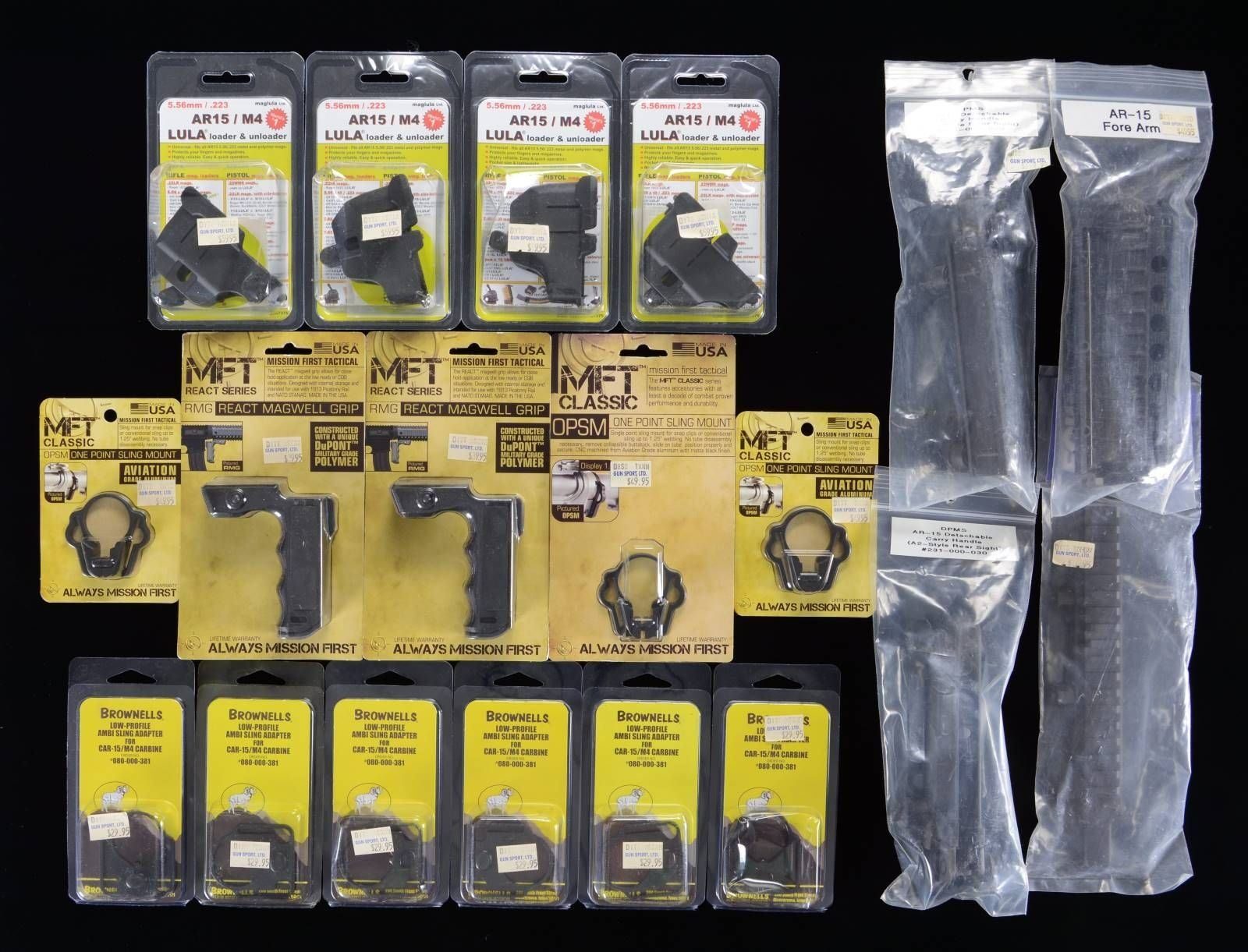 PARTS & ACCESSORIES. This grouping includes the following; 1) 2 DPMS Detachable Carry Handles w/ A2 adjustable rear peep sights. 2) 2 MFT React Series RMG React Magwell Grips. 3) 1 EGW 20 MOA Picatinny Rail 7" clamp on riser, 4) 4 AR15/M4 LULA loader / unloader. 5) 6 Brownells low profile Ambi-sling adapter for CAR-15 / M4 Carbine. 6) 3 MFT Classic OPSM single point sling mount. 7) 1 AR-15 Carbine AR-15 / M16 forearm. CONDITION: All parts appear to be new, in factory retail packaging. PROVENANCE: The Collection of Gun Sport Ltd owned by Jon R. Thomas. (02-20847-4/JZ) $400-800.