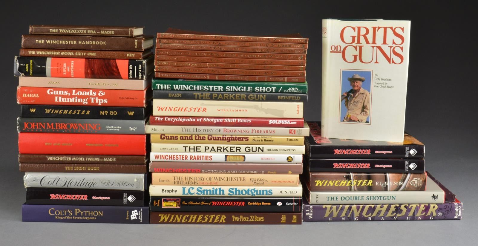 2 Lg. tubs of approx. 50 books. Notable titles include: “Colt’s Python King of the Seven Serpents” by Gurney Brown, 7 copies of “Winchester Shotguns” by Dennis Adler, “The Colt Heritage” by R. L. Wilson, “Winchester Rarities” by Tom Webster, “Winchester Shotguns & Shotshells” by Ronald W. Stadt, “Armax Vol. 6 1996”, “Guns, Loads & Hunting Tips” by Bob Hagel, “Complete Book of Rifles & Shotguns” by Jack O’Connor, “History of Browning Firearms” by David Miller, “The Encyclopedia of Shotgun Shell Boxes” by David Bacyk, “Winchester” by Herald F. Williamson & “Grits on Guns” by Grits Gresham, 8 Copies of “The Double Gun Journal” including premier & other early volumes. “Winchester Two-Piece .22 Boxes 1873 to 1927” by Richard L. Rains, “The Double Shotgun” by Don Zutz, “Firearms by Winchester” by C. B. Colby, “100 Years of Winchester Cartridge Boxes 1856 to 1956” by Ray T. Guiles & Daniel L. Shuey, “LC Smith Shotguns” by Lt. Col. William S. Brophy, “The Winchester Model 61” by C. H. Key, “The History of Winchester Firearms 1866-1980 5th Edition Revised” by Duncan Barnes, “The Winchester Handbook” by George Madis, “Guns and Gunfighters” by Bonanza Books, “Winchester An American Legend” by R. L. Wilson, “The Parker Gun” by Larry Baer, “Winchester Engraving” by R. L. Wilson, “Turnbull Restoration Catalogue”, “Jonathan Browning American Gun Maker” by John Browning & Curt Gentry, “Winchester Model 12” by Midas, “The Sight Book” by George Madis, “Winchester Repeating Firearms Company New Haven Connecticut 1916” a reprint of the 1916 catalogue, “Winchester Over a Century” by Bill West, “The Hunter Arms Company & the L. C. Smith gun” first & second editions by Rich Byaer, “The Winchester Era” by George Madis, “Winchester Rifles & Shotguns” by an unknown author, “Winchester Product Catalogue 1923” a reprint by C. H. Key, “The Parker Gun” by Larry Barry Baer, “Winchester Single Shot” by John Campbell, 2 copies of “American Gun Maker by John M. Browning” by an unknown author & “Parker: America’s Finest Shotgun” by Peter Johnson. CONDITION: most books are in very good to near excellent conditions. (02-13935/BT). $1,000-1,500.