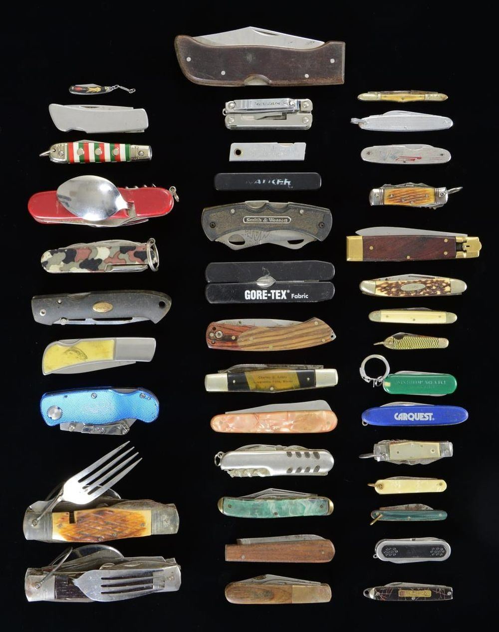 Grouping of miscellaneous pocket knives produced by various mfgs. Sizes range from miniature to large. Group includes several multi-tools, also of varying sizes. CONDITION: good, with knives exhibiting varying degrees of wear. Some knives exhibit some mild oxidation. 1 knife with moderate oxidation and is missing 1 grip panel. (02-21052/MLW). $150-250.