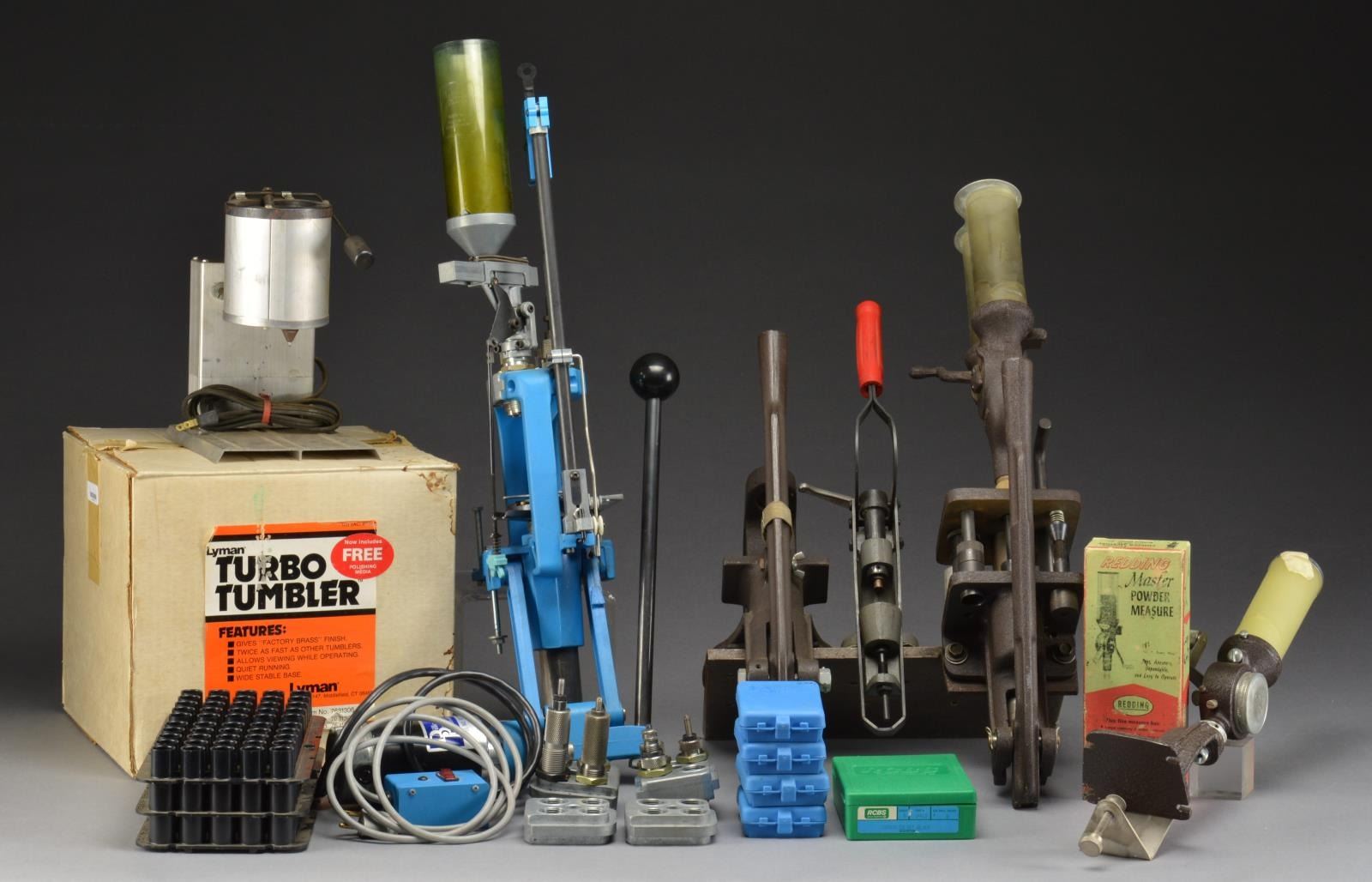 & SHOTGUN PRESS & ACCESSORIES. This lot also includes Lyman 450 sizer & lubricator / Herter’s powder measure / Lee melting pot / Lyman turbo tumbler. Dillon press has accessories, parts, paperwork, 4 station holders & loading die sets in 45 ACP, 30-06 & 308 Win. / Also included w/ lot is Dillon electric precision case trimmer. Shell plates include: 9mm, 45 ACP, 223 & 38/357. / Herter Super Model 3 “C” type reloading press w/ 2 priming arms & No. 1 shell holder. Shot shell press is marked “Herter’s Model 7.64.N72 M”, has 12 Ga. dies. / Lyman sizer/lubricator complete w/ 1 set of dies & wrench. / Herter powder measure appears complete. Herter’s powder scale pan is not present. / Lee 10lbs. production pot. / Lyman jumbo tumbler w/ media & factory box. CONDITION: Dillon appears in very good condition, other items are good used w/ possibility of missing sm. parts. (02-14111 & 02-14114/RW). $400-600.