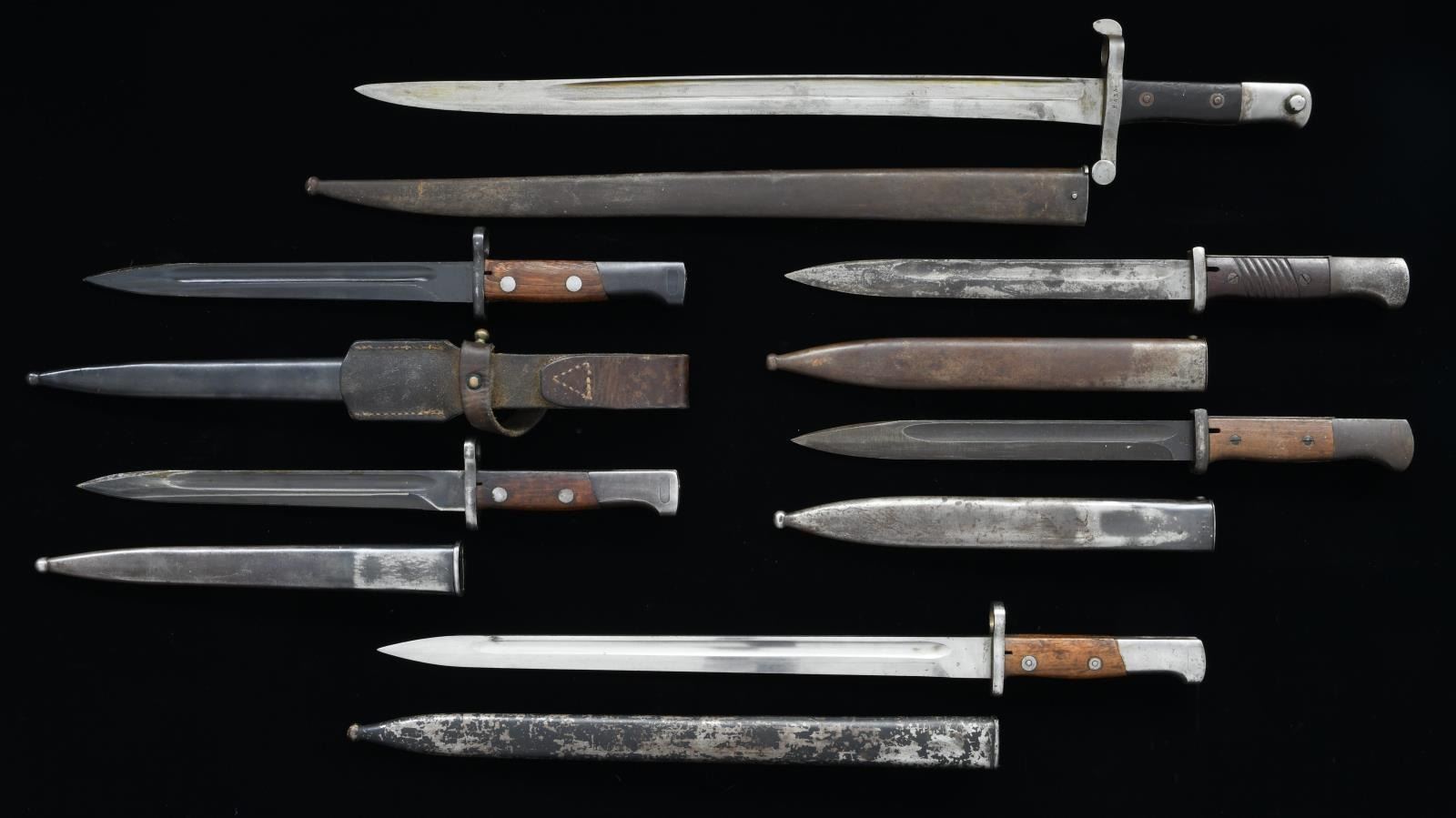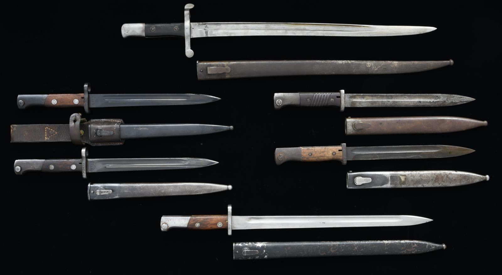 1) Portuguese Model 1885 Kropatschek. 18 1/2" fullered Yataghan blade. Blade is marked on right ricasso w/ "X" acceptance mark. Blade is marked on top in script "STEYR 1886". Straight cross guard w/ S# and acceptance mark. Smooth dark walnut grips. Birdshead pommel. Non matching steel scabbard. 2) German M 98K. 9 7/8" fullered blade. Blade marked on left ricasso "cof 43". Right ricasso has S#. Smooth walnut grips. Flash guard is present. Birdshead pommel. Steel scabbard is marked "41 asw". 3) German K98. 10" fullered blade. Blade is marked on left ricasso " 44 crs". Marked on right ricasso w/ S#. Dark brown composition grips w/ slanted grooves. Flash guard is present. Birdshead pommel. Matching steel scabbard. 4) Yugoslavian Model 1924. 15" unmarked bright fullered blade. Straight cross guard w/ muzzle ring. Smooth walnut grips w/ spanner type fasteners. Birdshead pommel. Unmarked steel scabbard. 5) Yugoslav Model 1924 short. 9 5/8" fullered blade. Cyrillic marked on right ricasso "44". S# on cross guard matches scabbard. Smooth hardwood grips w/ spanner type fasteners. Birdshead pommel. Blued finish. Steel scabbard has leather frog. 6) Yugoslav Model 1925 short. 9 5/8" fullered blade. Right ricasso is Cyrillic marked w/ "44". Straight cross guard is numbered to match steel scabbard. Smooth walnut grips w/ spanner type fasteners. Birdshead pommel. Blued finish on scabbard & bayonet. CONDITION: bayonets have wear commensurate w/ long service w/ light oxidation, spots of fine pitting, scattered scratches & handling marks. Scabbards may have shallow dents & flaking finish. Leather frog has tight stitching & although worn appears serviceable. (02-19611-9/RW). $300-600.