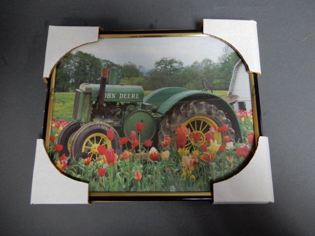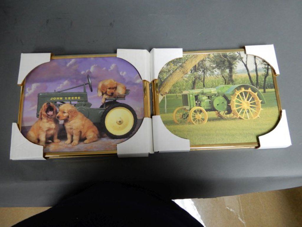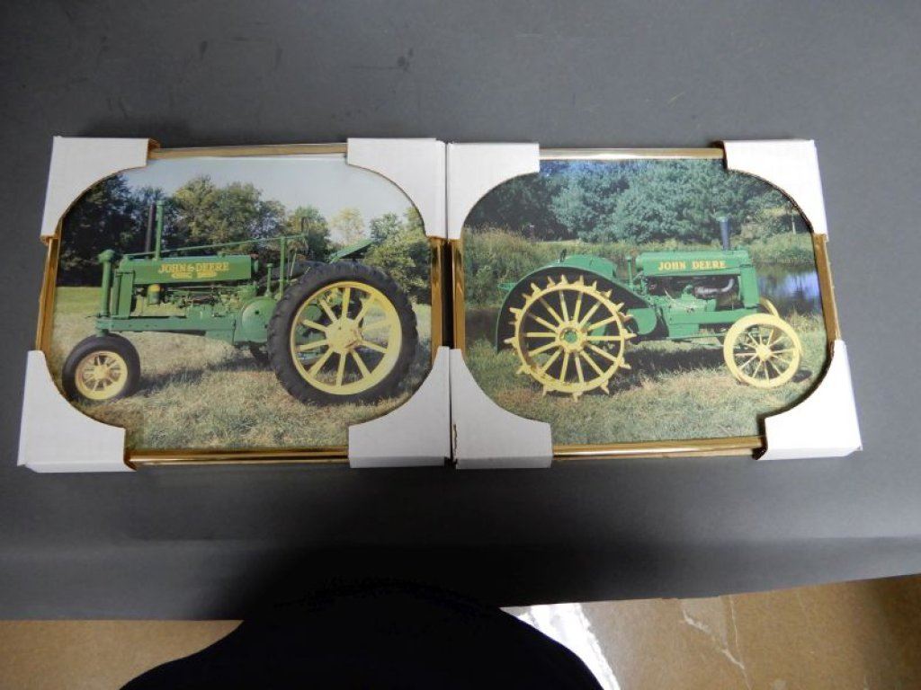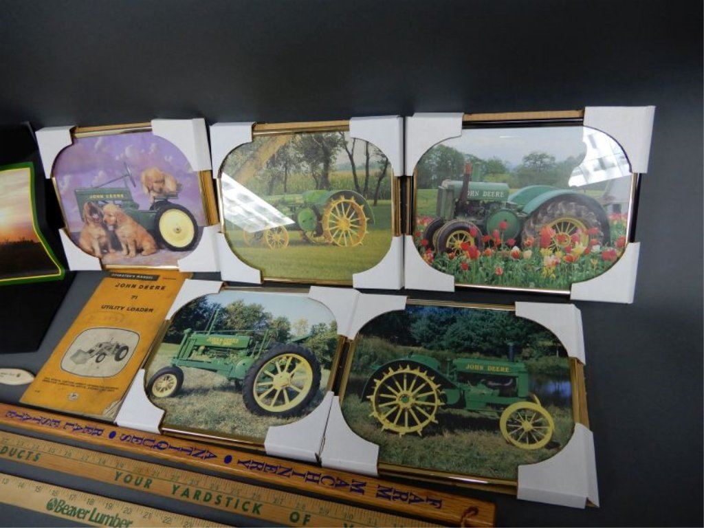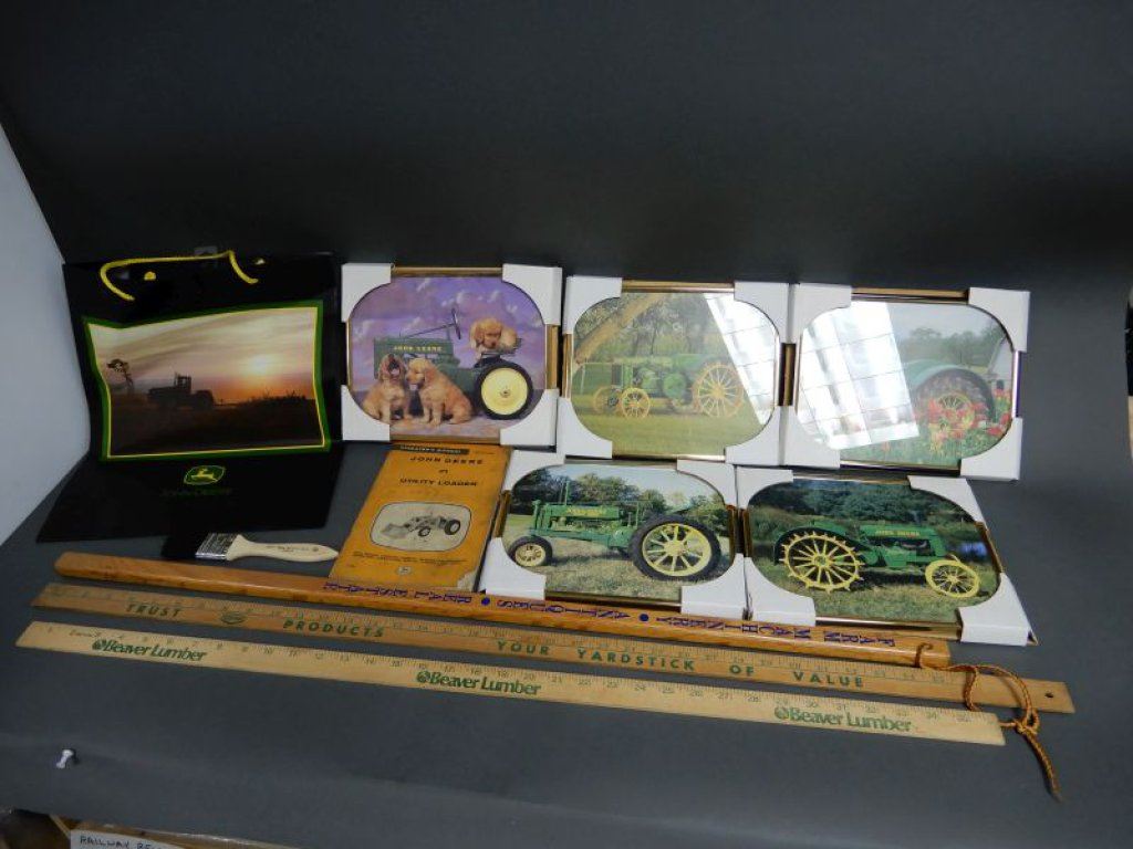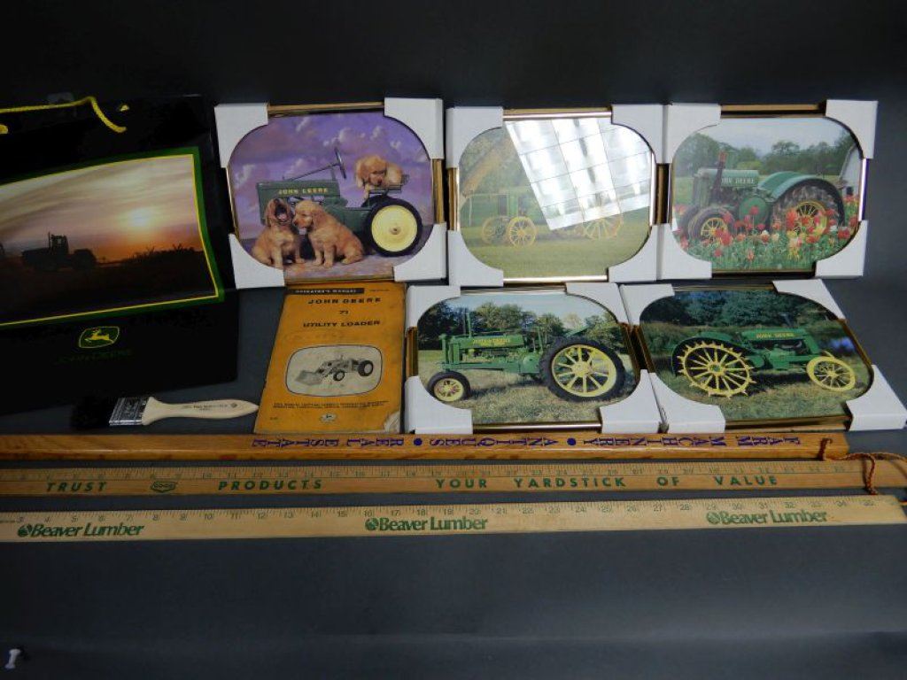 GROUPING OF FARM RELATED COLLECTIBLES JD OPERATOR MANUAL- 3 ADV. YARD STICKS- 5 FRAMED JD TRACTOR PICTURES IN ORIG. PACKAGING- JD SHOPPING BAG- PAINT BRUSH LOCATION: LOWER BACKROOM