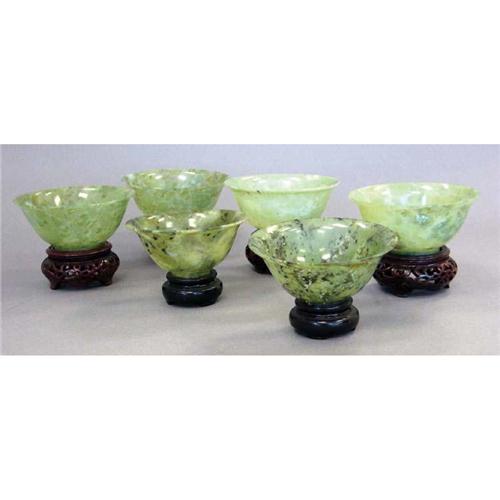 GROUPING OF JADE BOWLS on teak stands