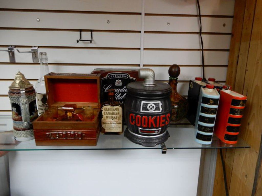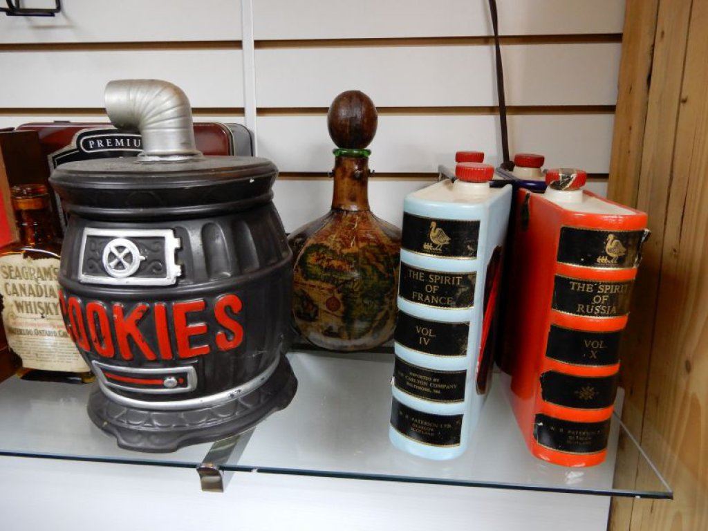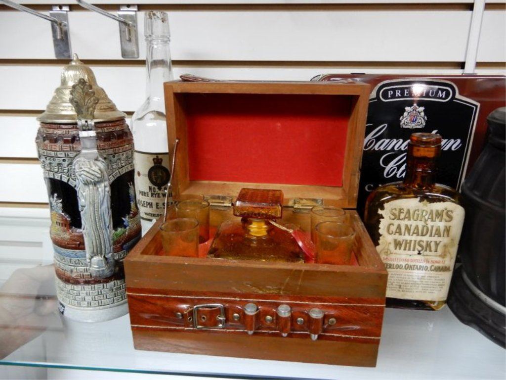 GROUPING OF LIQUOR DECANTERS, STEINS TINS
