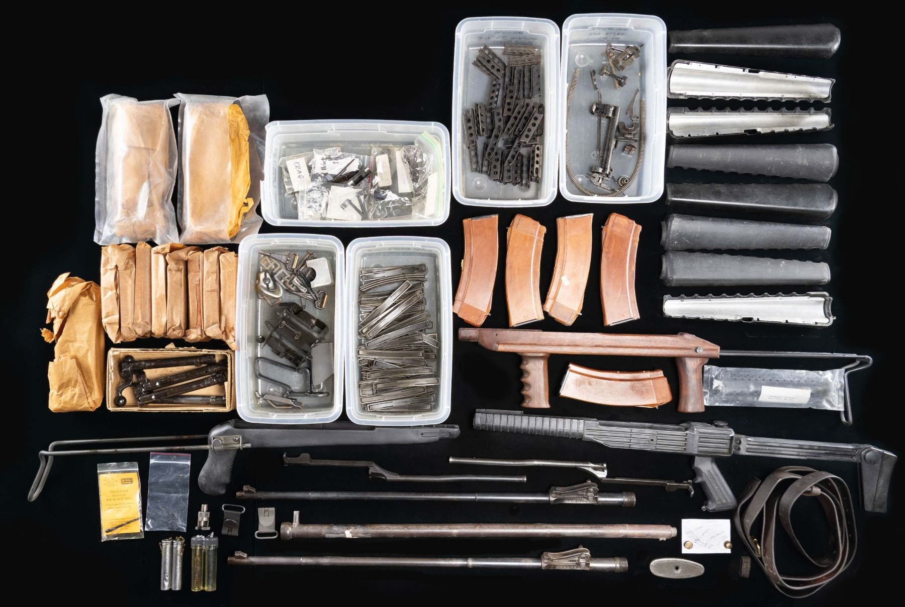 GROUPING OF MILITARY GUN PARTS, STOCKS, CLIPS AND