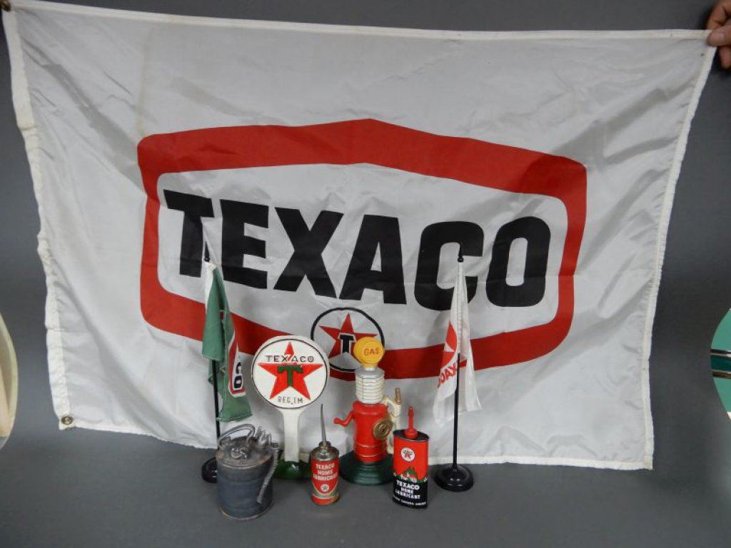 GROUPING OF TEXACO COLLECTIBLES FLAG - 44" X 30" - OILERS- DOOR STOP- SMALL FLAGS LOCATION: LOWER RIGHT