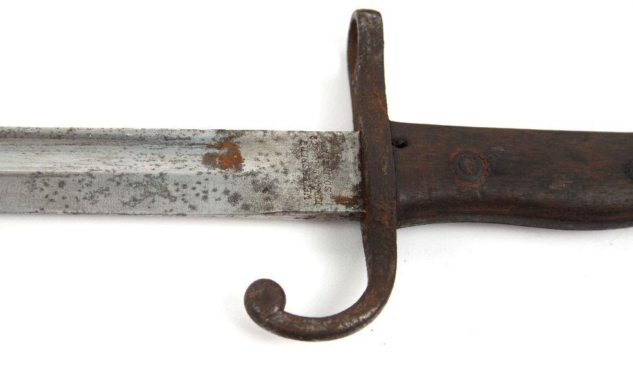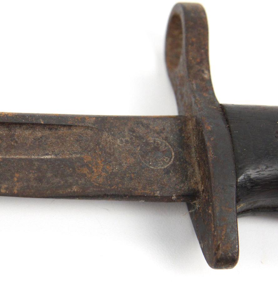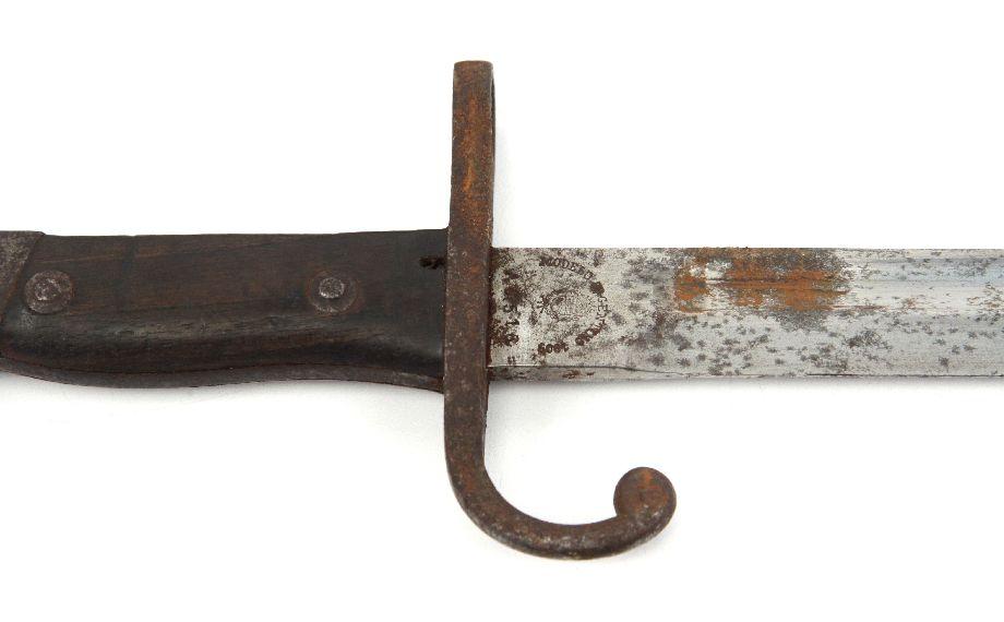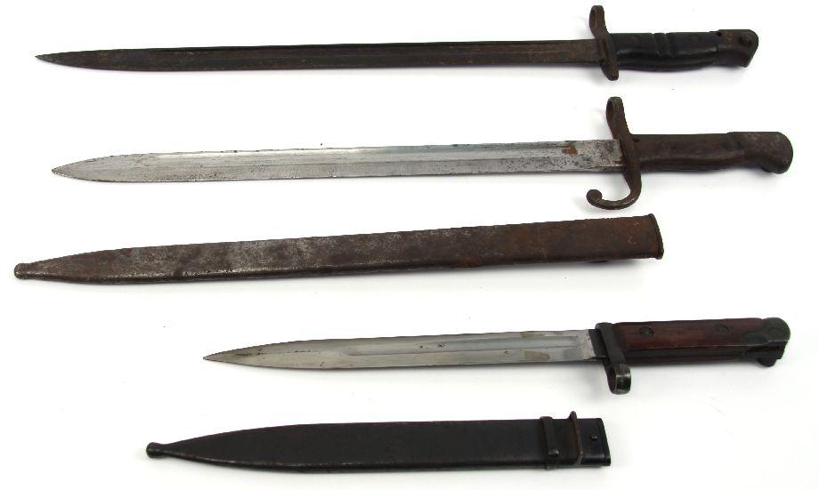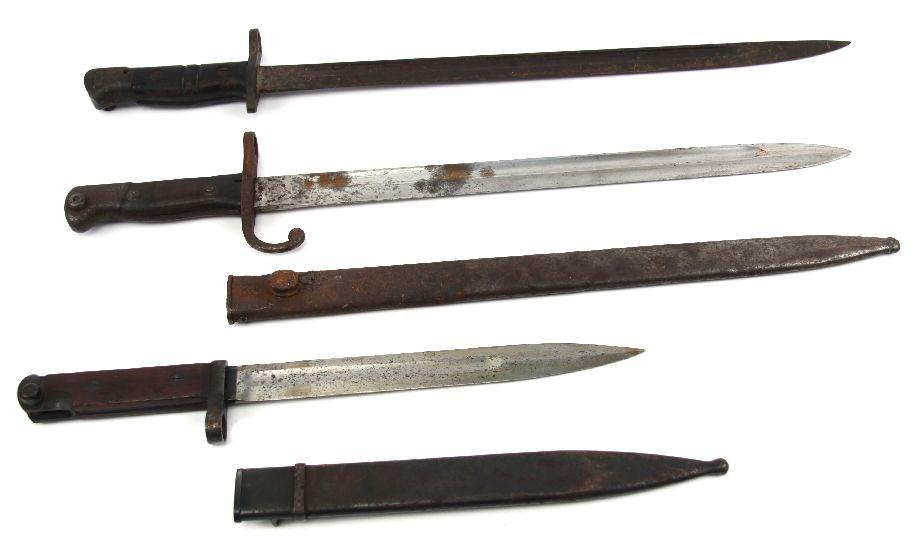 Three bayonets. Remington 1918, no scabbard, pitted blade; Argentine Model 1909 with scabbard, some pitting to blade, rust on scabbard; unmarked bayonet with steel scabbard, in good condition.