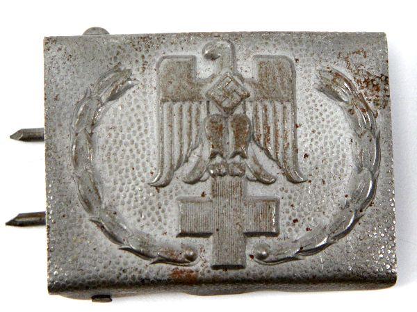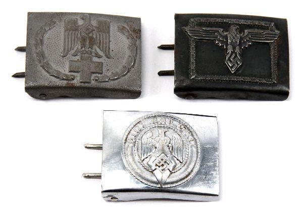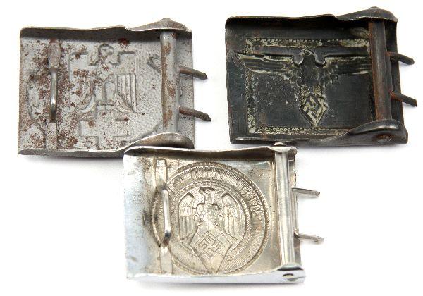 German social welfare organization pebbled texture steel buckle, with no makers mark on the back; a Hitler youth dress belt buckle, marked "RZM M4/38"; a brass Hitler youth buckle, marked "473" on back. All buckles measure 2.5 by 2 inches, and all are in overall very good condition.