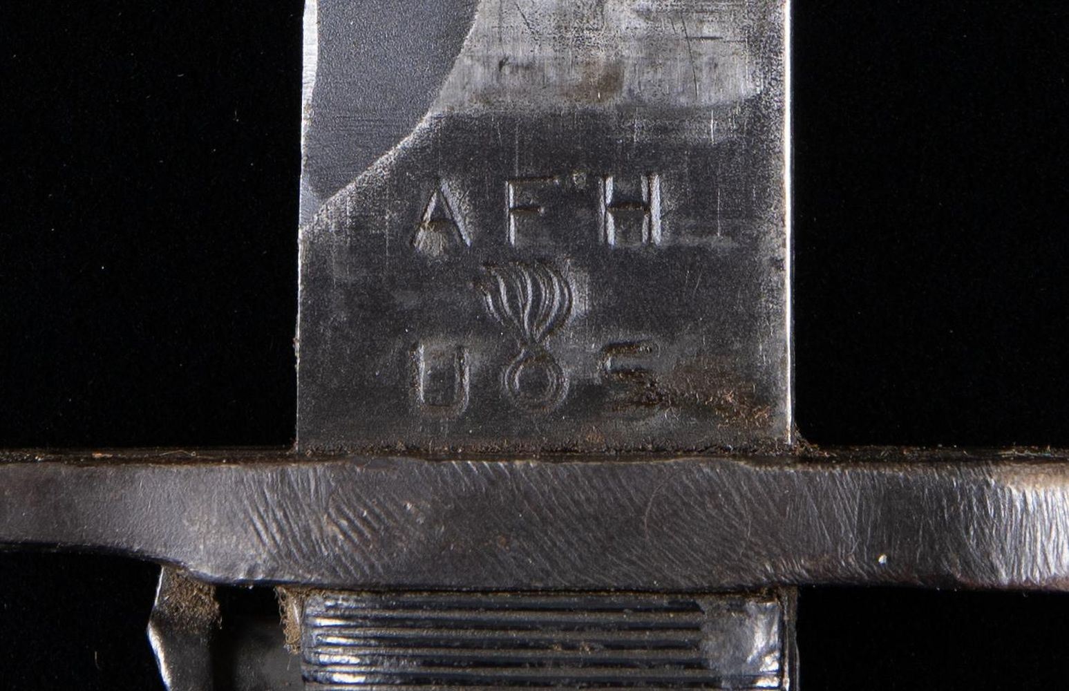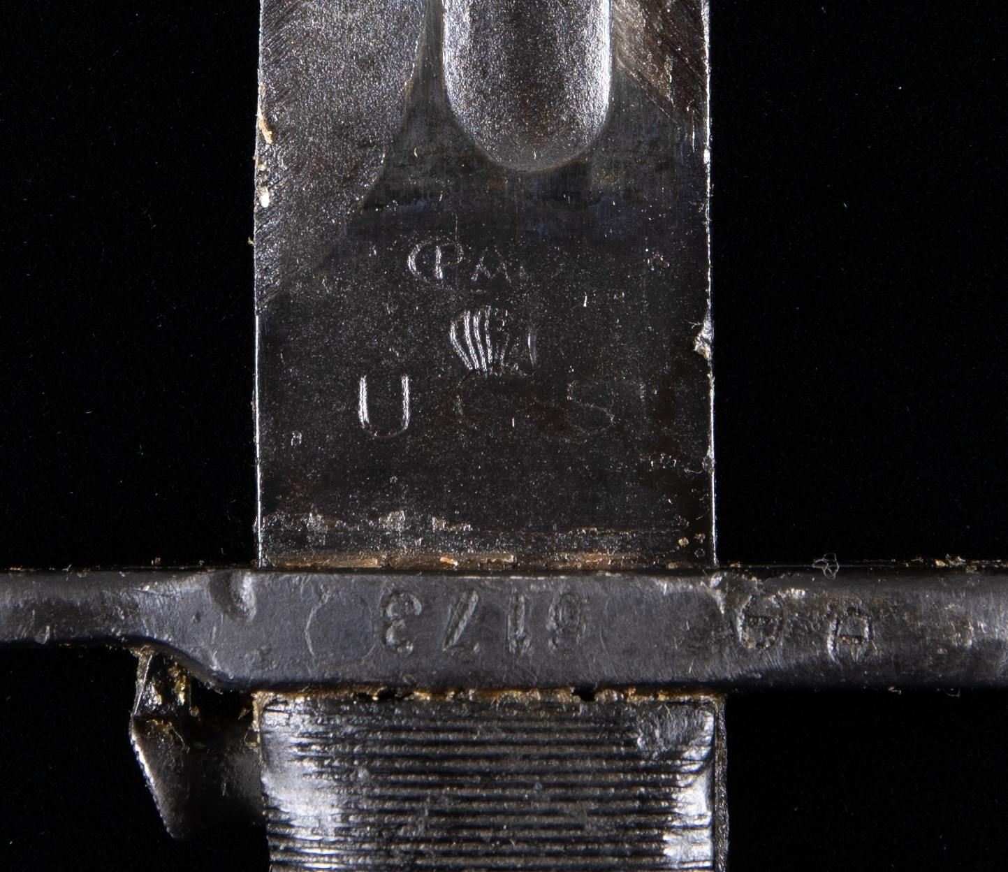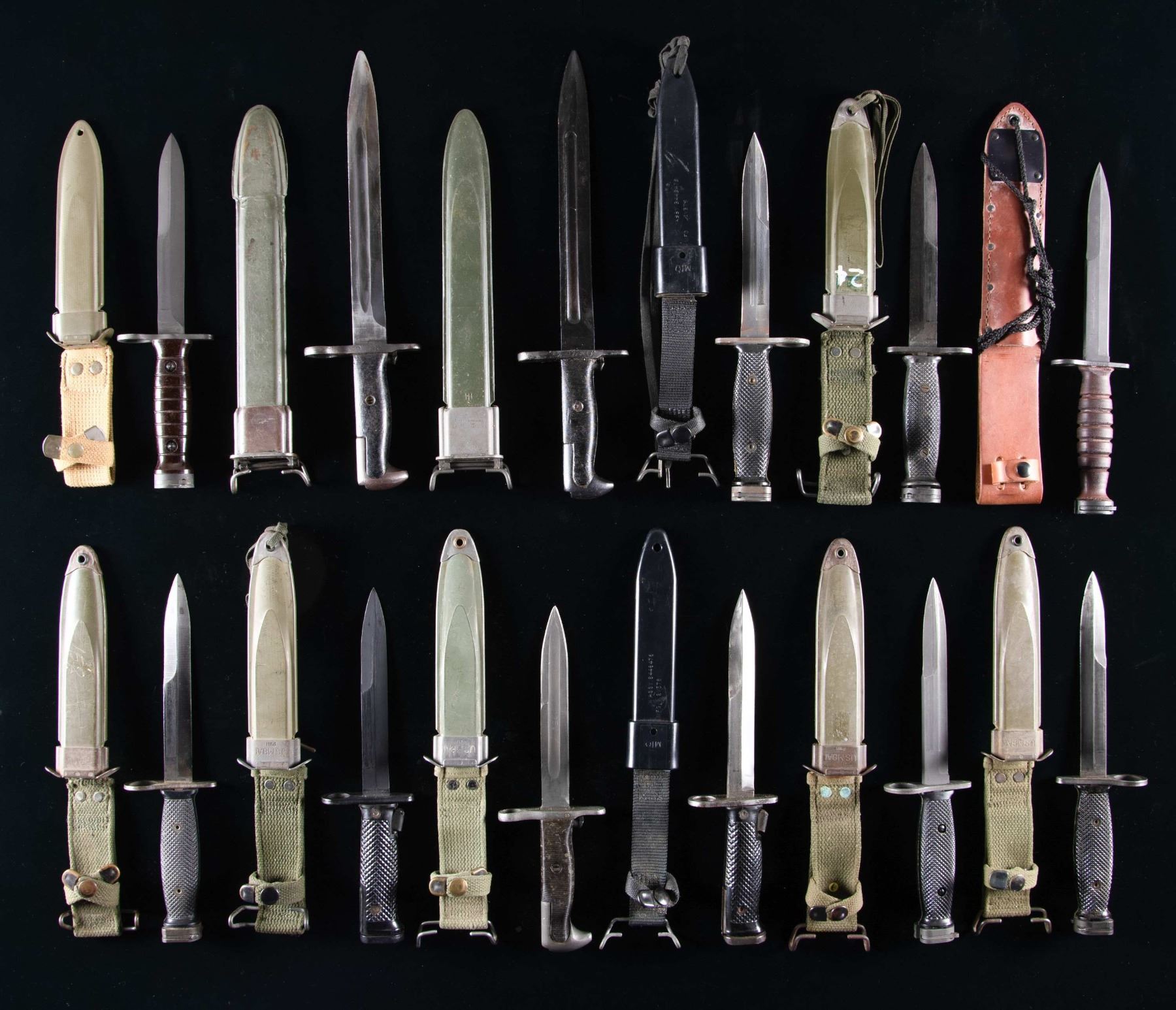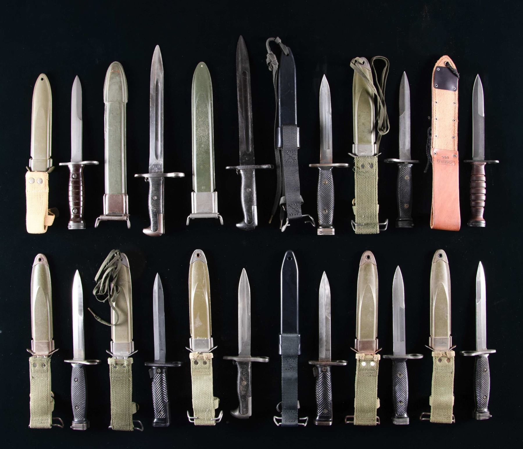 BAYONETS. 1) U.S. M1 Bayonet. 9 1/2" parkerized fullered blade. 14 1/8" overall. Blade marked on left ricasso "AFH / flaming bomb / U.S.". Grooved plastic grips. Green plastic scabbard has been modified w/ a brass tip. Scabbard & bayonet blade carry non-matching serial numbers. Muzzle ring has been replaced w/ one of a larger diameter. 2) U.S. M1 Bayonet. 9 3/4". Parkerized fullered blade. 14 1/4" overall. Blade is marked w/ "PAL" in oval & "U.S. / flaming bomb". Crossguard carries two separate serial numbers. Grooved plastic grips. Plastic scabbard is marked on metal throat "U.S. / M7". 3) U.S. M1 Bayonet. Has been shortened to make a fighting knife. 6 1/2" parkerized fullered blade. Fuller extends through tip. 11" overall. Grooved plastic handles. Latch is functional. Plastic scabbard w/ webbed frog marked "U.S. / M8A1". 4) U.S. M4 Bayonet. 6 3/4" parkerized blade. 11 5/8" overall. Bayonet is marked on front of crossguard "K-M4". Black plastic checkered grip. Grip suffers from noted distortion & shrinkage. Green plastic scabbard w/ "24" rack number. Scabbard is marked on throat "U.S. / M8A1". Green lanyard is present. 5) U.S. M4 Bayonet. Reproduction bayonet has 6 1/2" parkerized blade. 11 1/2" overall. Crossguard marked "U.S. / M4 / CAMILLUS". Stacked leather washer handle. Brown leather sheath marked "CAMILLUS / U.S.A." on back. Tip has sheet metal reinforcement on both sides. 6) U.S. M6 Bayonet for M14 Rifle. 6 5/8" blade. 11 3/8" overall. Marked on front of crossguard "U.S. M6 / IMPERIAL". Black checkered plastic grips. Green plastic U.S. M8A1 scabbard w/ web frog. 7) U.S. M6 Bayonet for M14 Rifle. 6 5/8" parkerized blade. 11 3/8" overall. Checkered black plastic grips. Blade has been sharpened & partially polished. Green plastic U.S. M8A1 scabbard. 8) U.S. M7 Bayonet. 6 3/4" parkerized blade. 11 7/8" overall. Marked on front of crossguard w/ "U.S. M7 / IMPERIAL". Green plastic U.S. M8A1 scabbard. 9) U.S. M7 Bayonet. 6 5/8" blade. 11 3/4" overall. Crossguard marked on front "U.S. M7 / ONTARIO". Black plastic scabbard w/ black web frog. Scabbard is marked "M10". 10) U.S. M7 Bayonet. 6 5/8" blade. 11 3/4" overall. Crossguard is marked "U.S. M7 / ONTARIO". Black checkered plastic grips. Black plastic scabbard w/ black nylon frog. Scabbard is marked "M10". 11) U.S. M7 Bayonet. 6 3/4" blade. 11 7/8" overall. Crossguard marked on front "U.S. M7 / BOC". Green plastic scabbard marked "U.S. M8A1". 12) U.S. M7 Type Bayonet. 6 1/2" blade. 11 3/8" overall. Bayonet & scabbard are unmarked. Grooved dark brown plastic grips. Green plastic scabbard w/ khaki colored web frog. CONDITION: except as noted, bayonets & scabbards range from light to moderate wear w/ scuffing, staining & minor handling marks. All appear in good serviceable condition. (02-24537-10/RW). NON-GUN. $700-900.