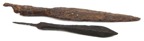 Two viking projectile tips, from around 800 to 1050 A.D. A tanged arrow head, measuring 4 1/4 inches long, in very good preservation, and a Viking lance head, measuring about 3 3/4 inches long, plus socket. Very good preservation. Both tips with copies of COA's.