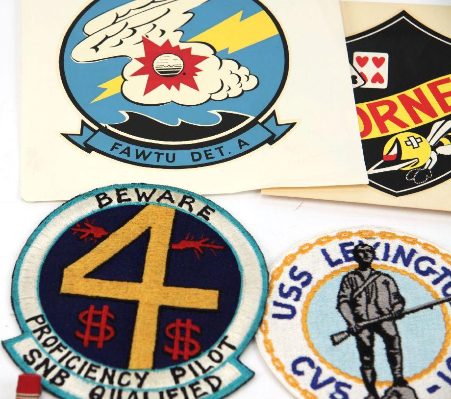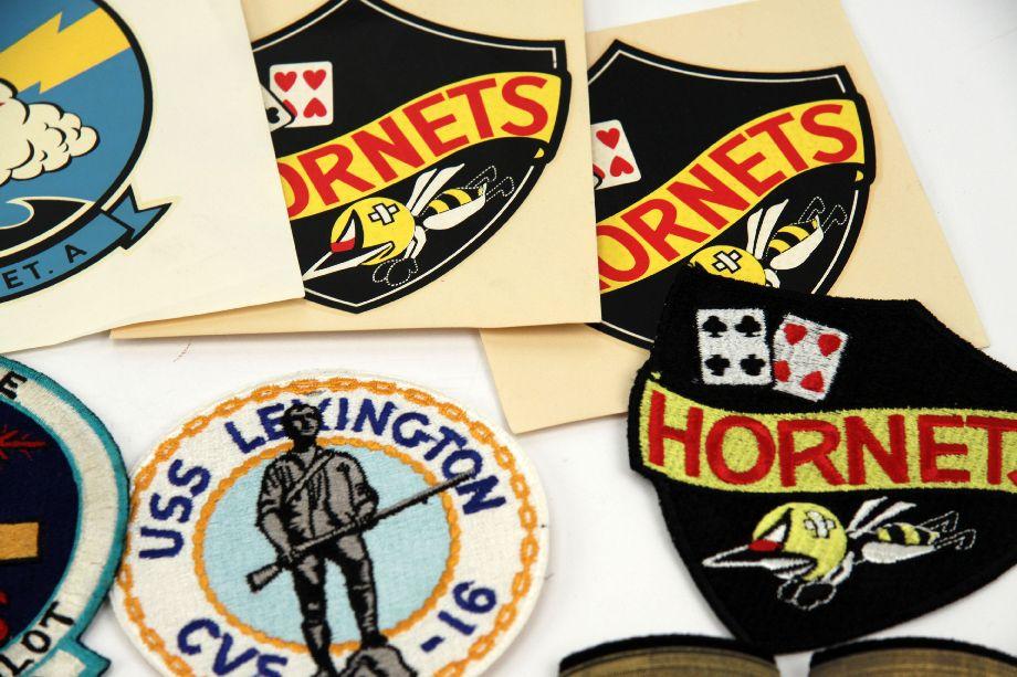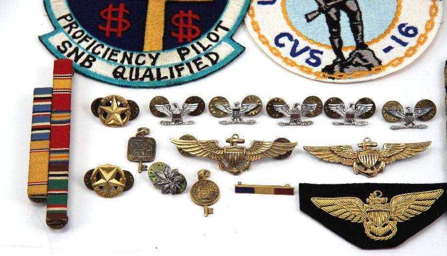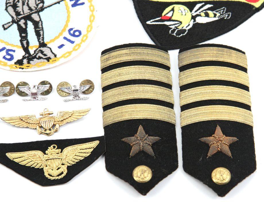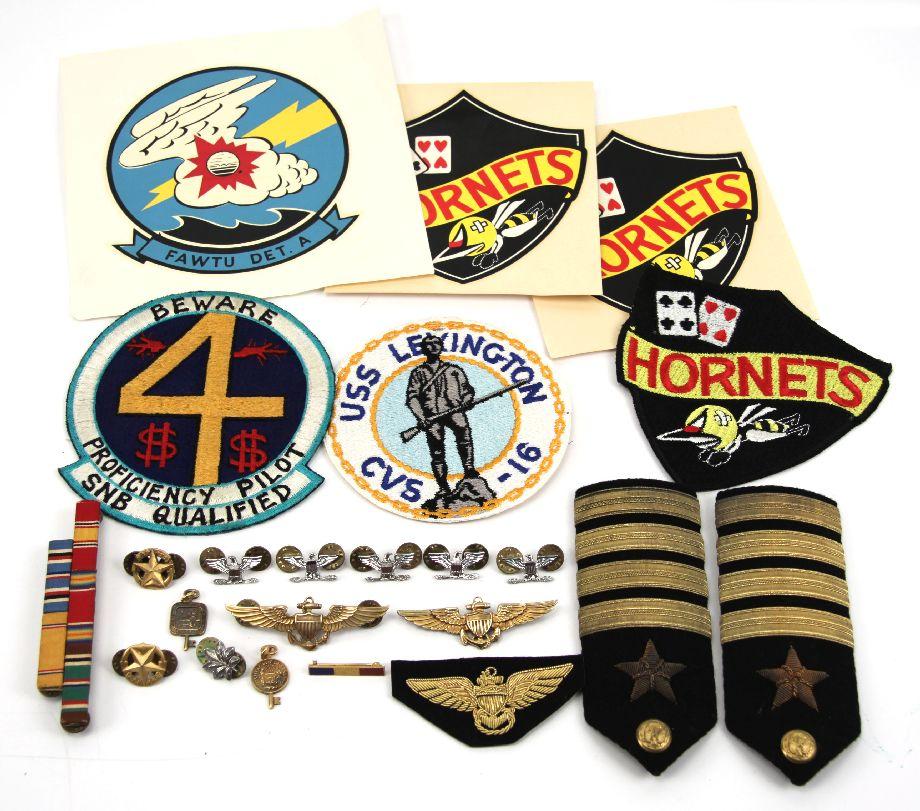 Grouping of insignia. Two sets of aviators wings (gold fill), and one bullion patch set; five sterling silver colonel insignia and silver leaf; Captain's shoulder boards; ribbon bars; USS Lexington patch; Hornets patch and two decals; proficiency pilot patch; FAWTU decal. All in good condition.