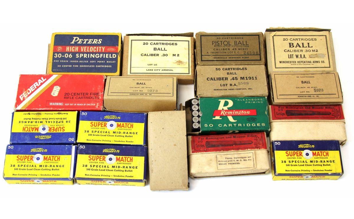 GROUPING OF VINTAGE AMMUNITION BOXES & EMPTY BRASS Grouping of vintage ammunition boxes, many with empty brass. 7mm, .45-70, .38 spl & more. Caliber / Guage: mixed Brand: mixed Condition: