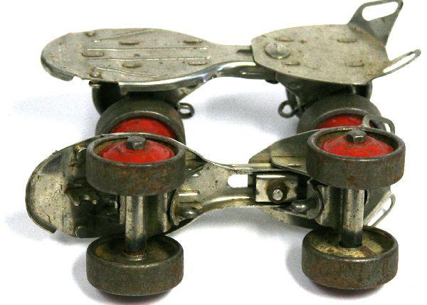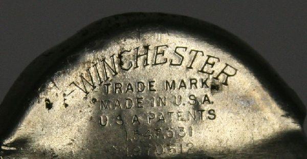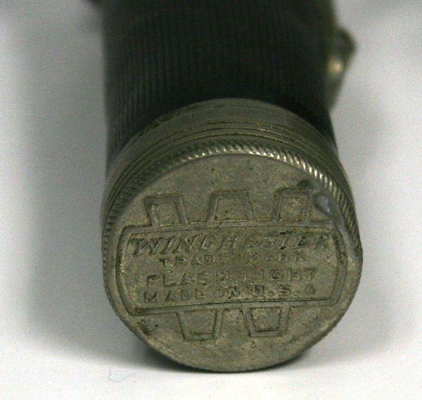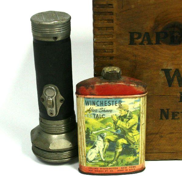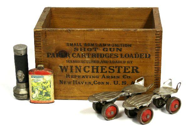 Vintage Winchester manufactured items including a Winchester flashlight, Winchester children's roller skates, a can of Winchester after shave talc powder, and a Winchester dovetailed shot shell crate. Items are in good condition, with expected age.
