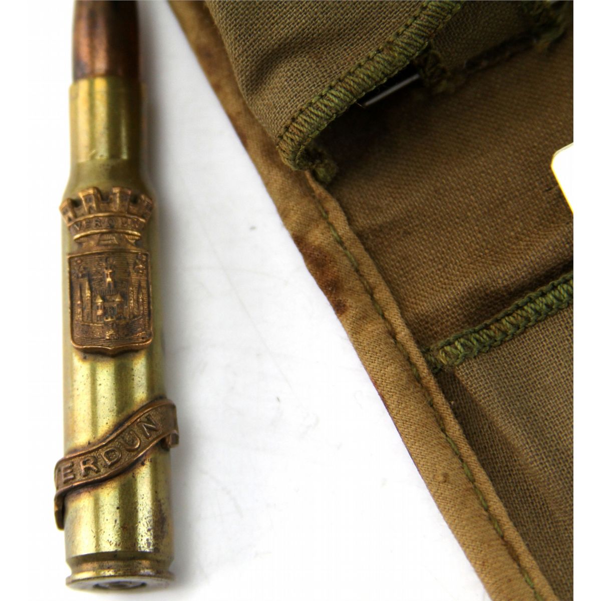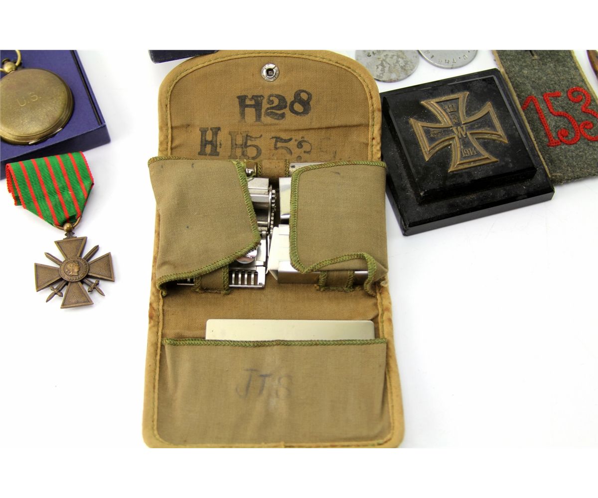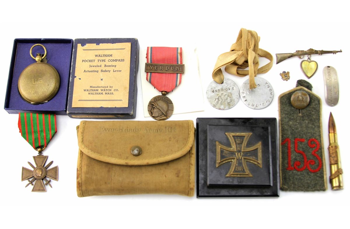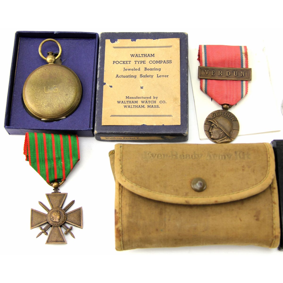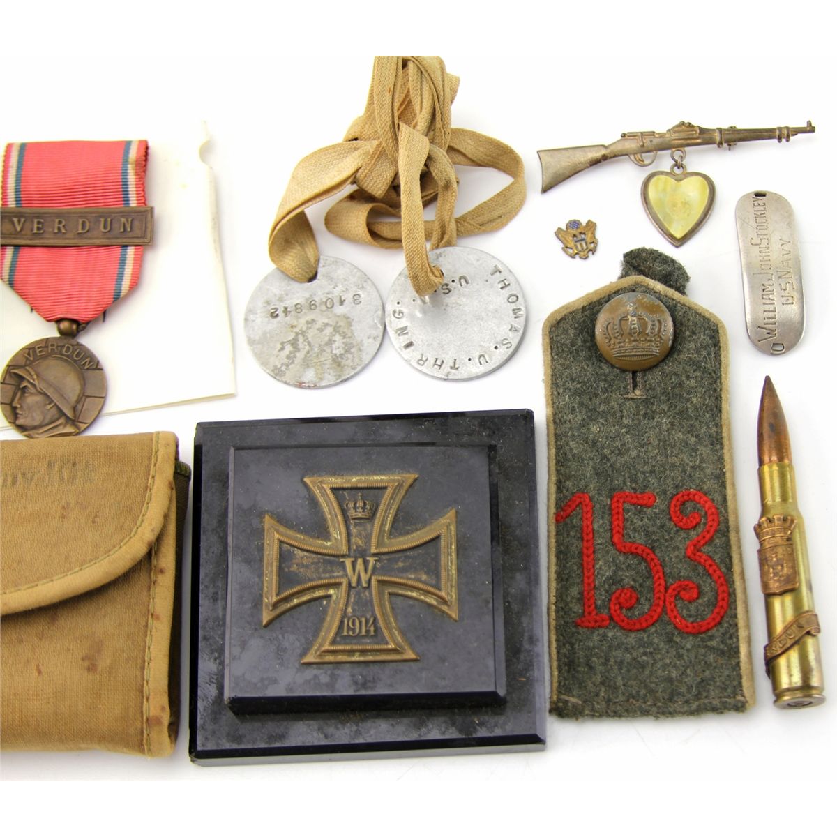 GROUPING OF WWI RELATED ITEMS MIXED COUNTRY Mixed lot of WWI related items, including Iron Cross paperweight, Verdun medal, Verdun trench art cartridge, shaving kit, US Waltham compass, US dog tags, and more. Country: Mixed Condition: Various condition, most good