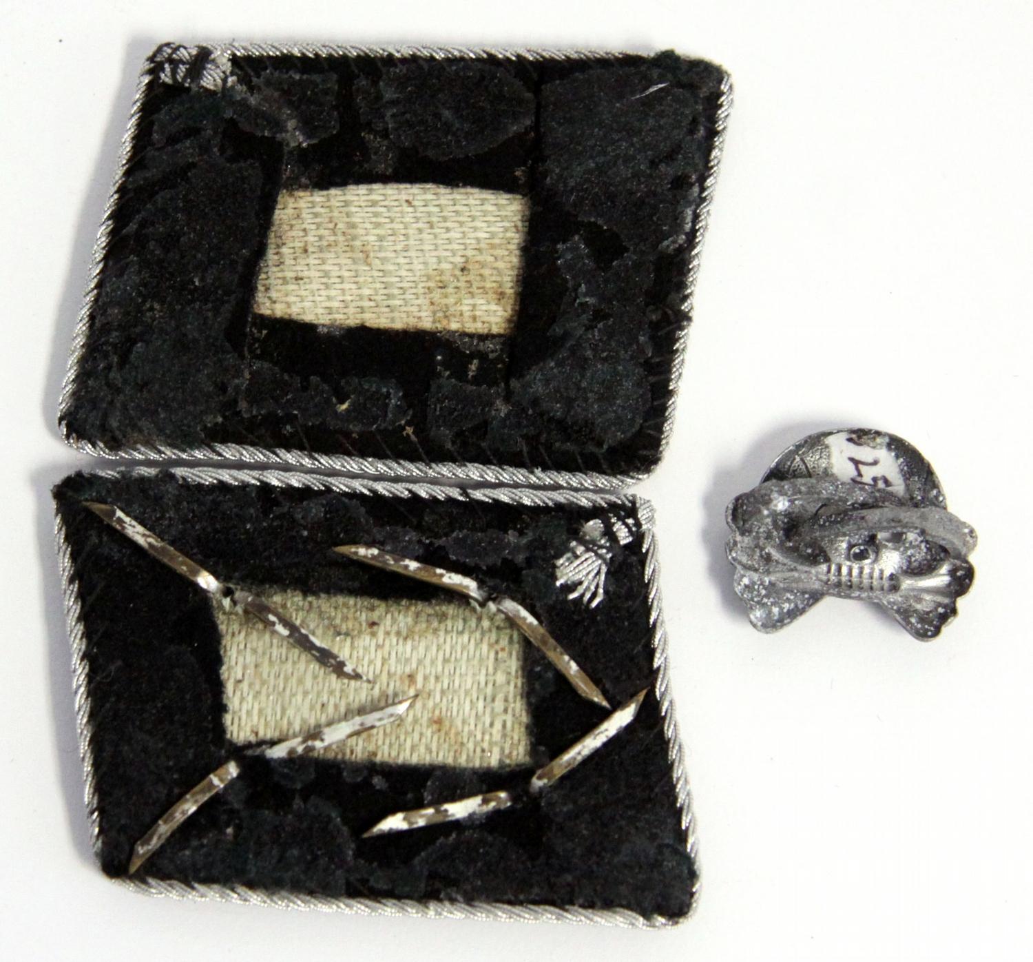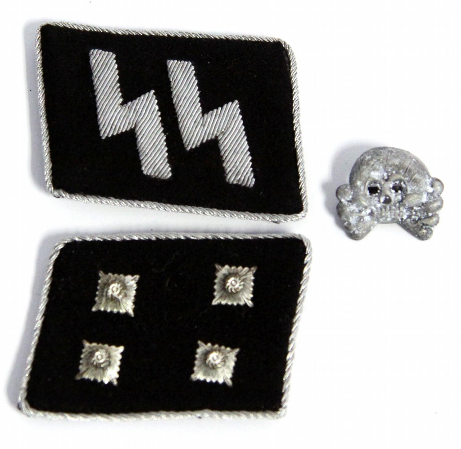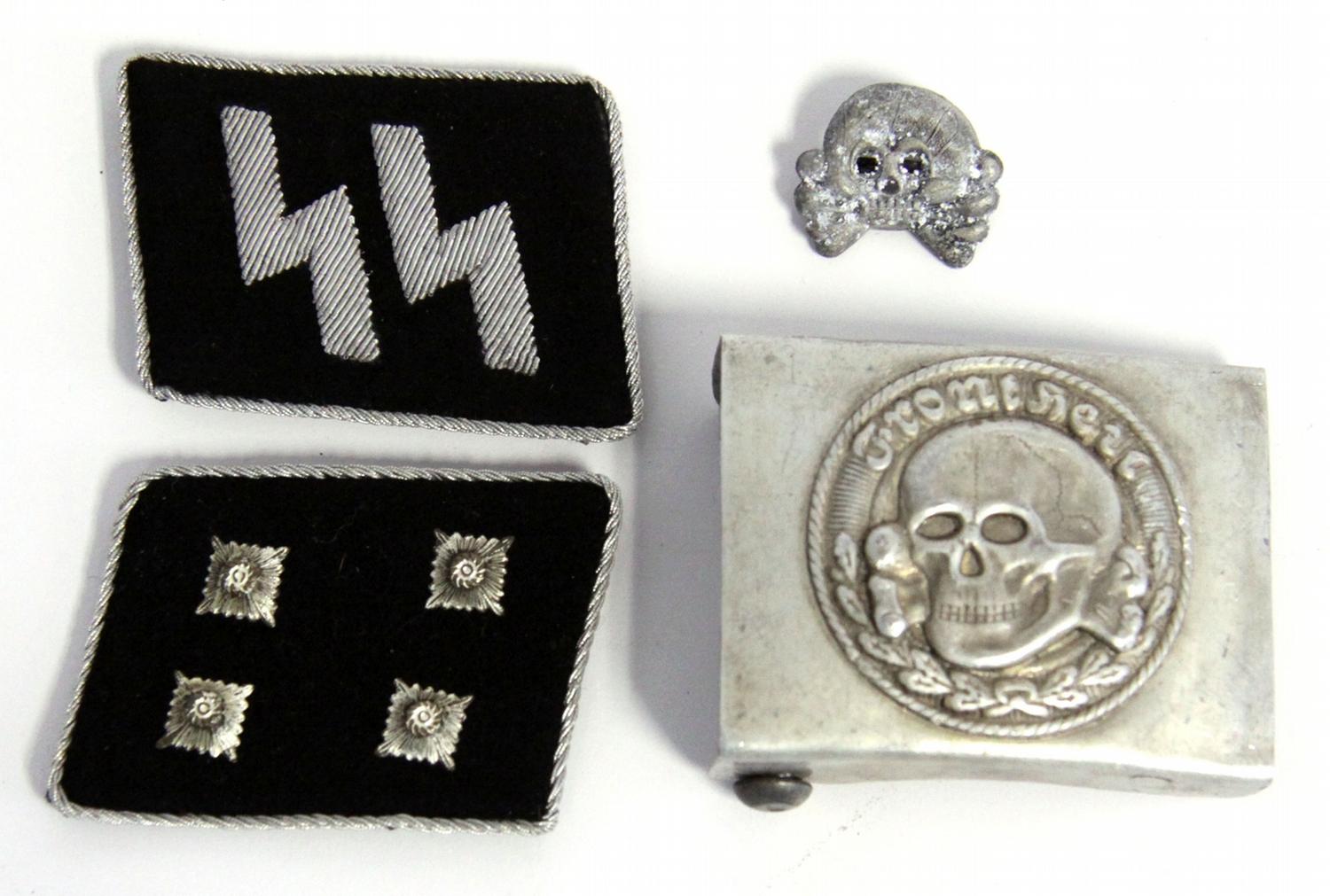 Lot of four WWII German SS items. SS collar tabs, with sturmbannfuhrer rank, SS belt buckle, RZM, marked "M34/2" on inside. and totenkopf skull hat pin.