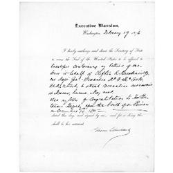 <b>890. GROVER CLEVELAND</b> (1837 - 1908) 22nd and 24th President of the United States, supported civil service and fiscal reform. Good content partly-printed D.S. as President, 1p. 4to., Washington, Feb. 17, 1896, orders the Secretary of State to affix the Seal to: "<i>Envelopes containing my letters of credence in behalf of Clifton R. Breckinridge and major Genl. Alexander McDowell McCook, U.S.A., to attend coronation ceremonies at Moscow, Russia, May next. Also my letter of congratulations to Her Britannic Majesty upon the birth of a Prince on December 14, 1895...</i>" Very good. Seems Cleveland was able to kill two birds with one stone: he sends his emissaries to attend the coronation of Russian Tsar Nicholas II and Tsarina Alexandra, and at the same time honors the birth of King George V's son, Albert, destined to become King George VI. Interestingly, in 1917 George V took the controversial decision to deny political asylum to his cousin, Nicholas II, who was later executed by the Bolsheviks. A great association! <b>$300-500</b>
