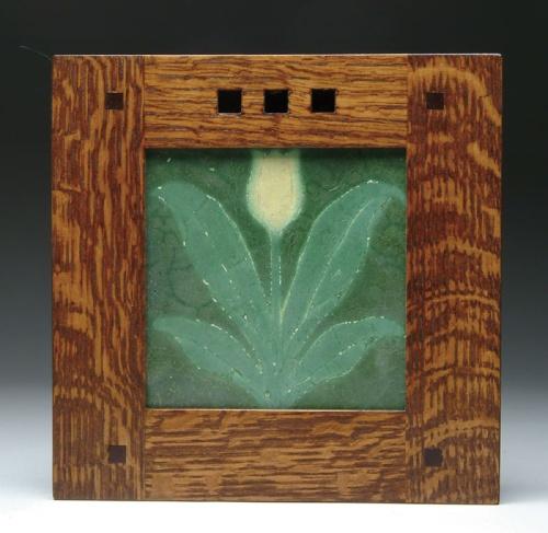GRUEBY POTTERY TILE. Wonderful pottery tile has green leaves and yellow tulip against a dark green background. Framed in a contemporary handmade oak frame. SIZE: Tile: 6 in. sq. Overall: 9 in. sq. Illegible impressed mark on the reverse. CONDITION: Very good to excellent. 5-60829