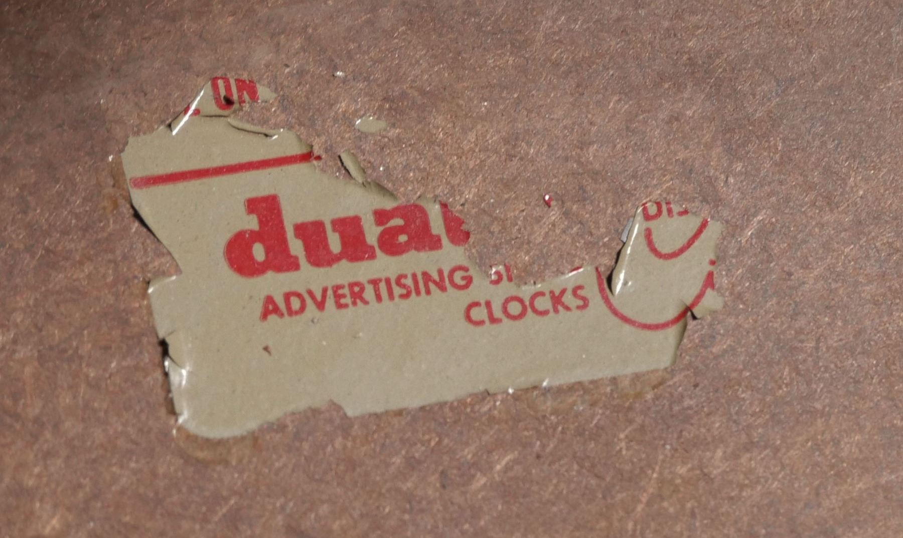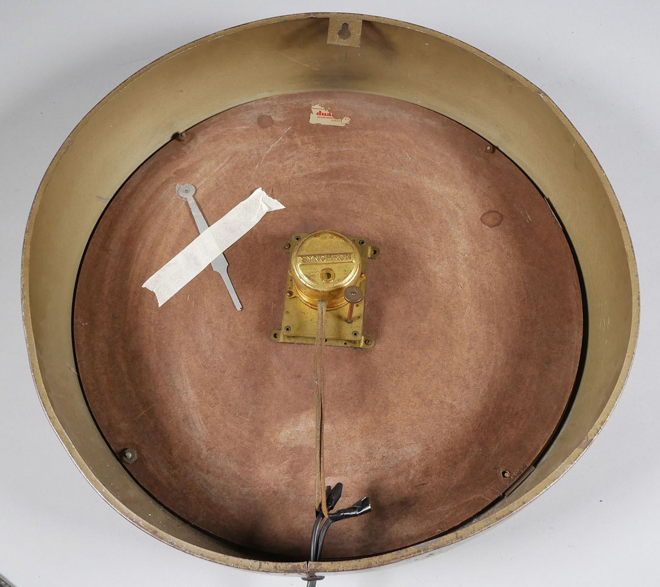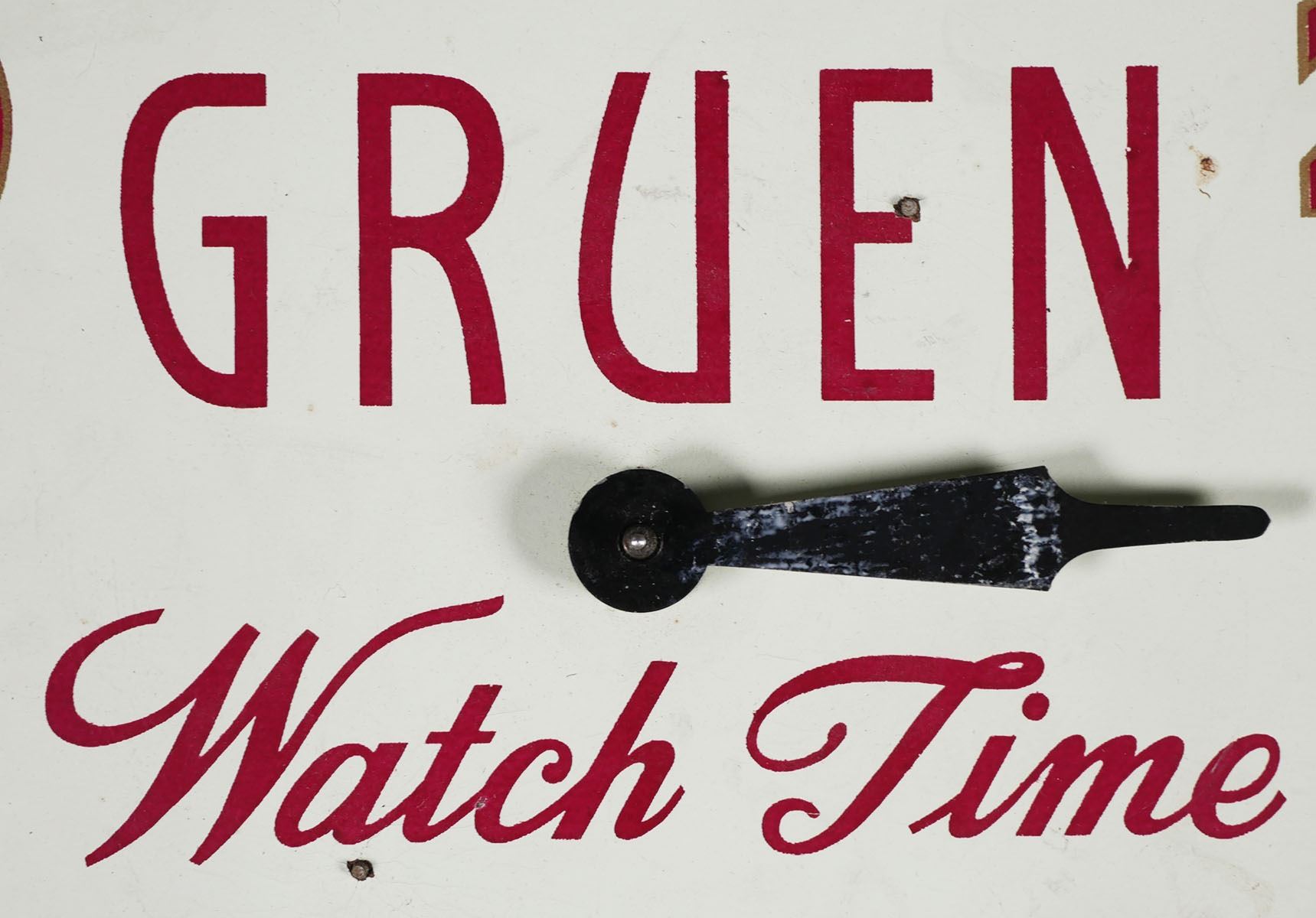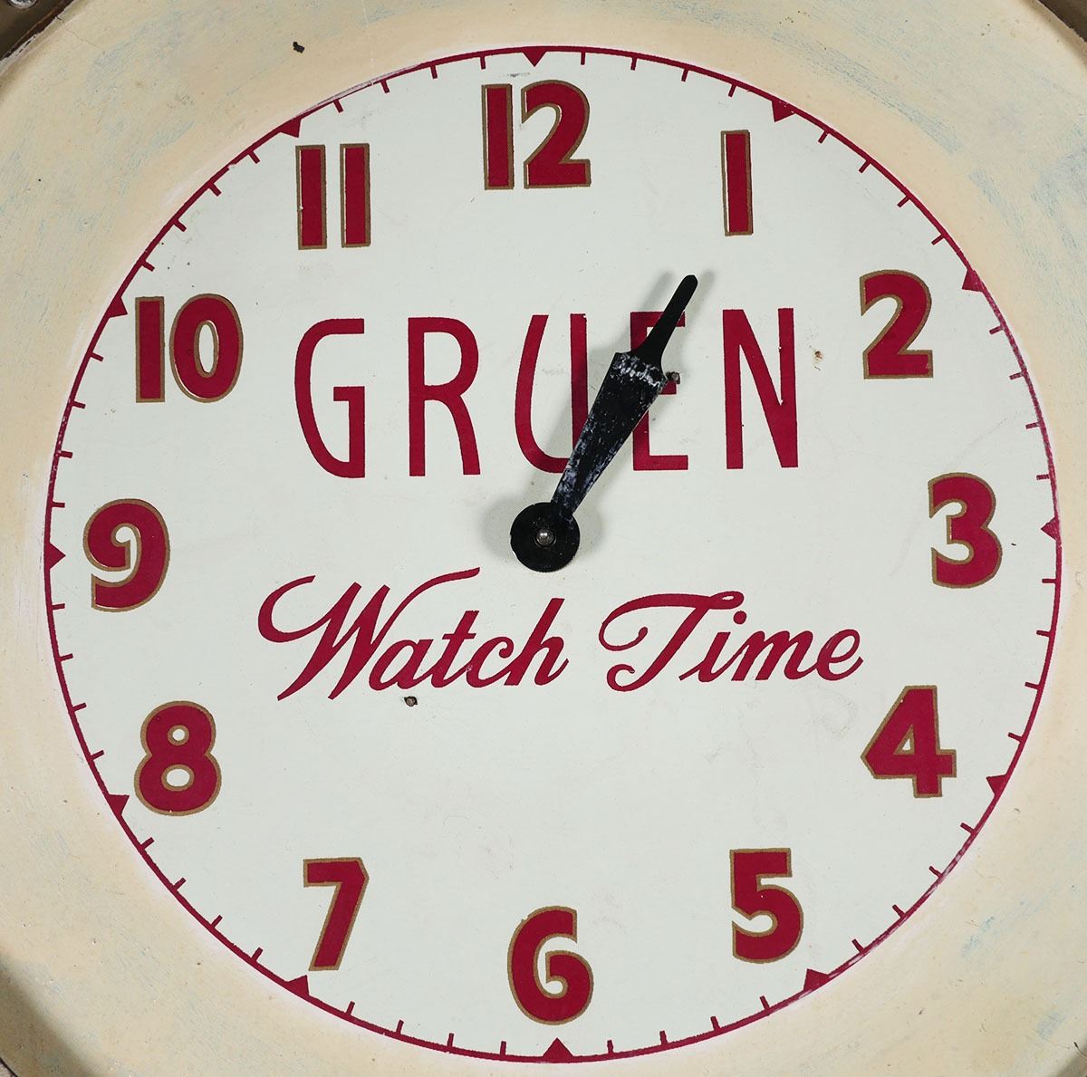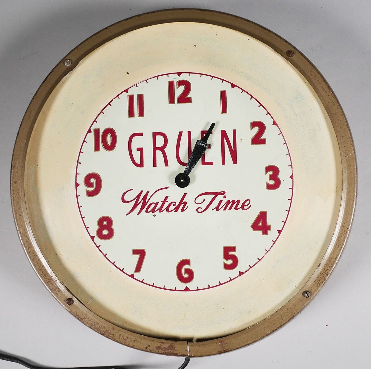 Vintage Gruen advertising electric wall clock. Synchron motor which has been re-wired runs. Clock face has been re-painted at some point in time, metal case has some small bends, dents & paint loss. Minute hand is taped to back of clock. Clock is approx. 16" in diameter x 3 1/4". See photos for more details on condition.